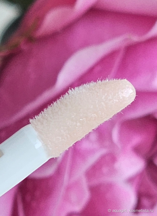 Блеск содержит мельчайший шиммер, который не выглядит отдельными блёстками, но даёт лёгкое сияние.