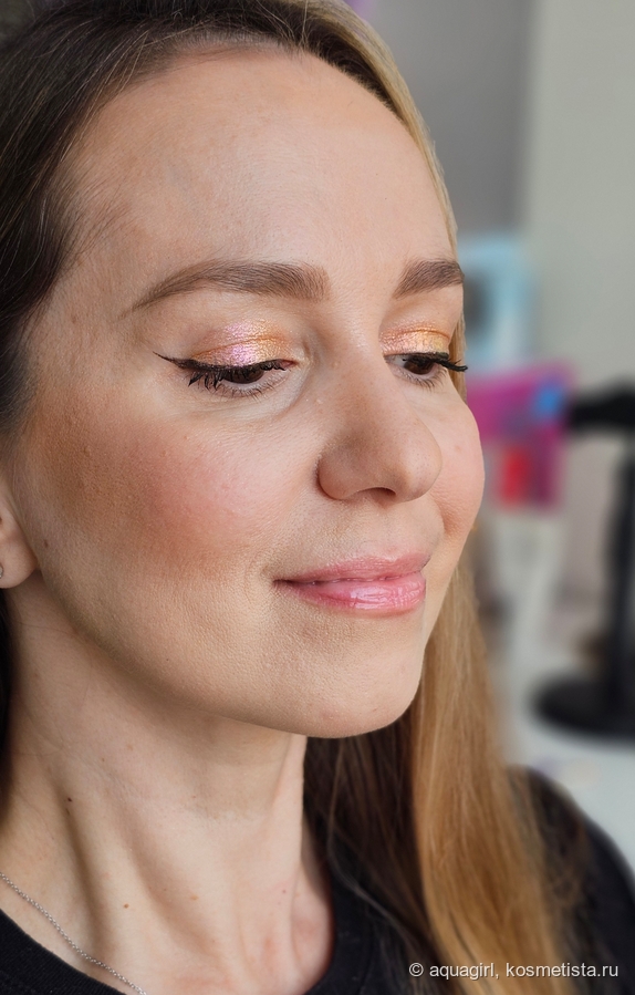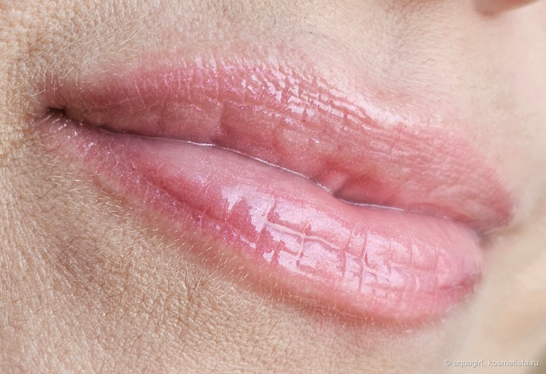 Тоже блесточки розовые, и та же водная гладь на губах, очень нежно и красиво!