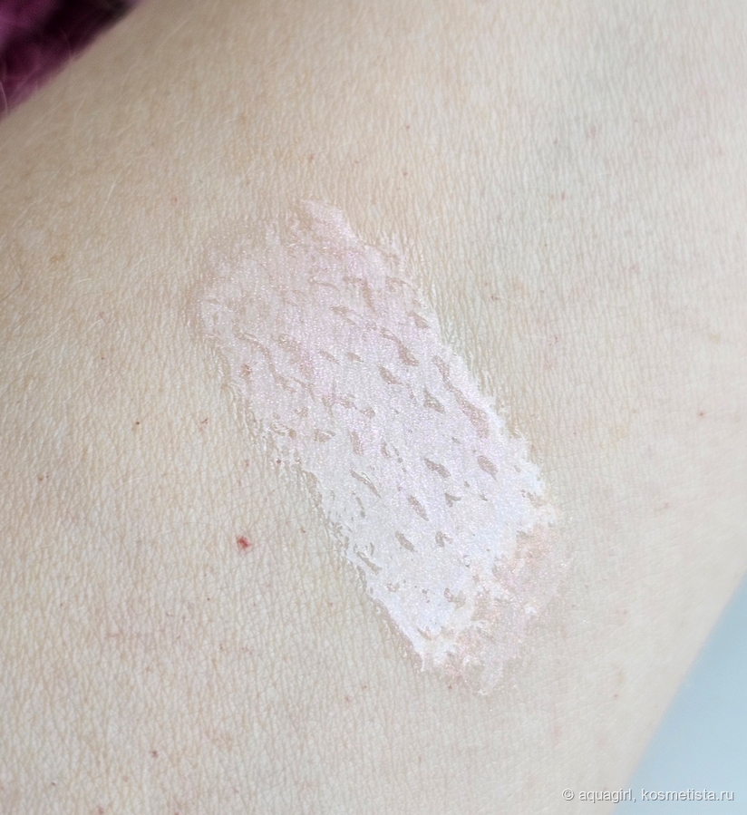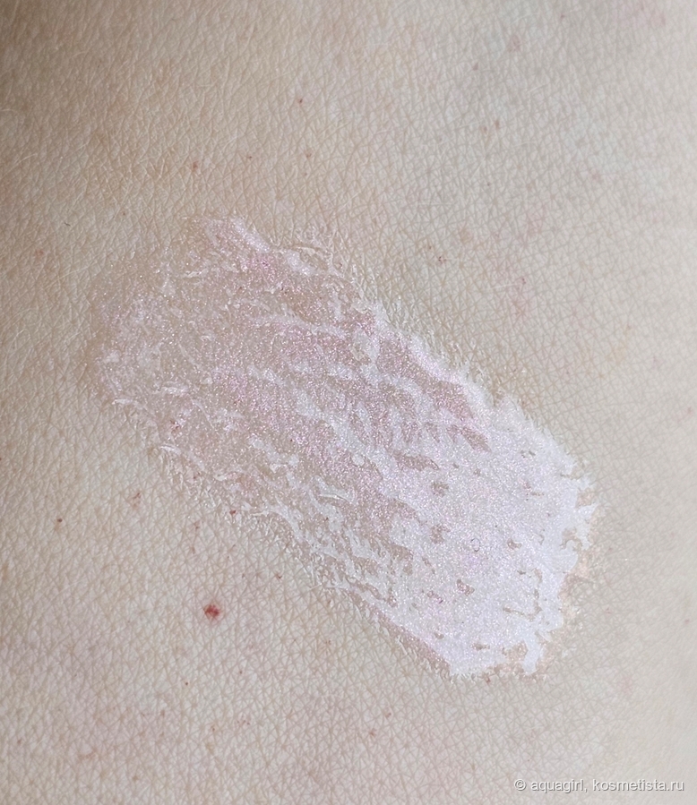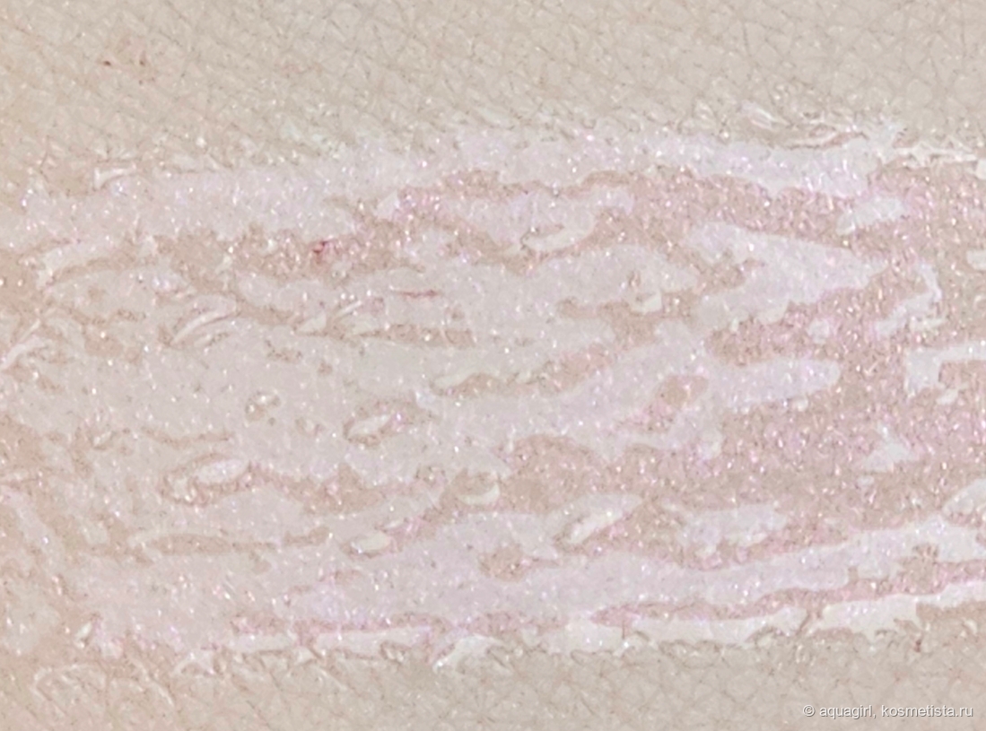 Прозрачная основа содержит большое количество мельчайших сияющих частиц розового оттенка. Блеск можно наслаивать — чем толще слой, тем заметнее розовый перелив.