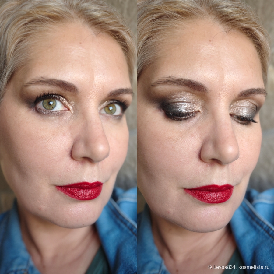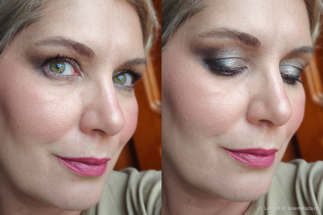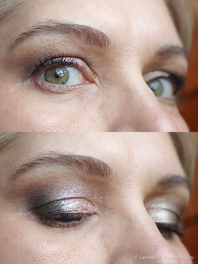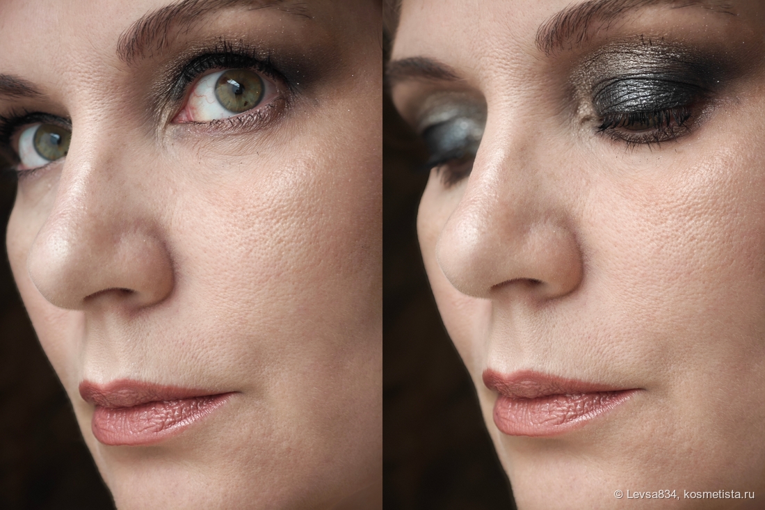 Этот матовый именно чёрный, не серый, но он не самый плотный из аналогичных, поскольку он сухой. Мне понравился, мне легко с ним, но инструкции по работе лучше следовать. И да, ещё, не стоит наносить этот оттенок на влажную кожу. База этим теням не нужна, но сразу поправлю себя, мне база не нужна с большинством теней.