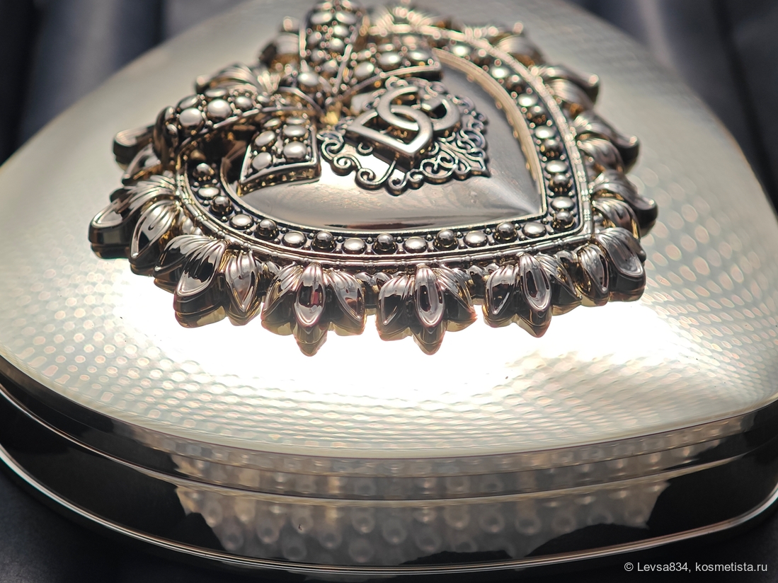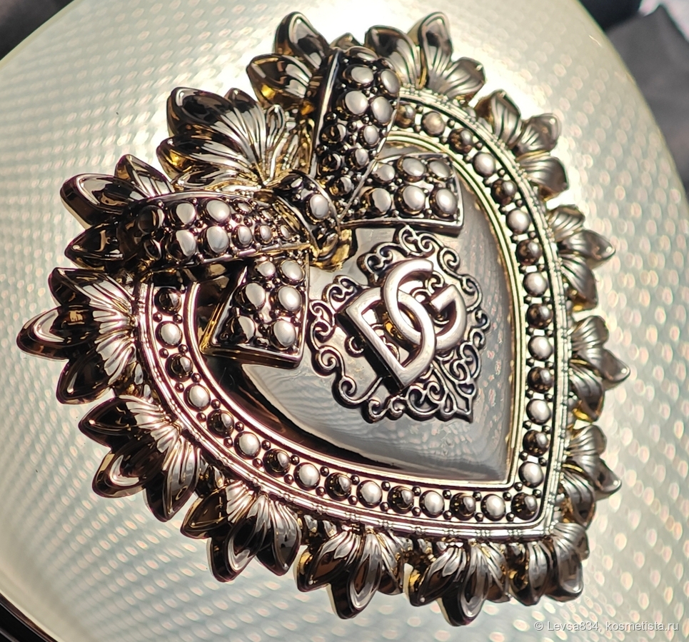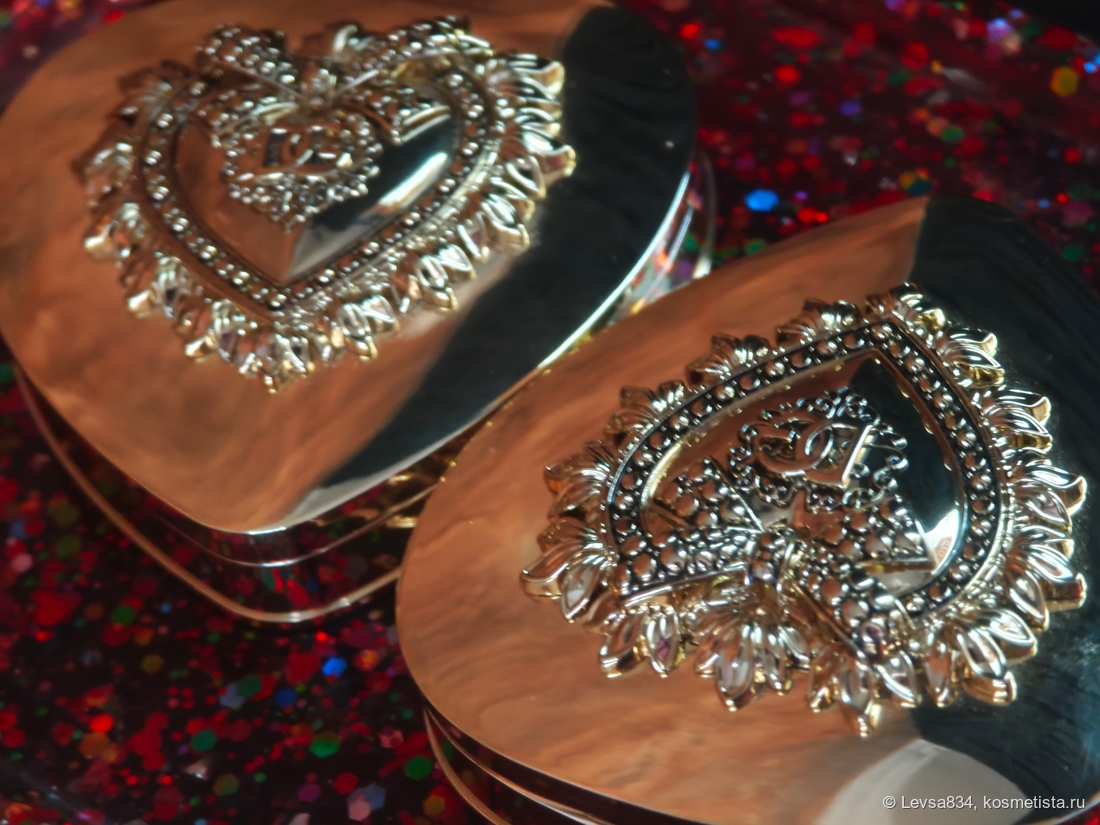 На крышке, снаружи украшенной затейливым вензелем, установлено отличное зеркало, я в него постоянно гляжу, делая макияж, сжимая при этом палетку в ладони. Размер и форма сердца словно для ладони и созданы, не хочется выпускать из рук эту вещицу. (Фотографировать, впрочем, это золотое отражающее устройство сложно, оно как зеркало, хочет показать в себе всё вокруг, поэтому опять очень простые фоны.)