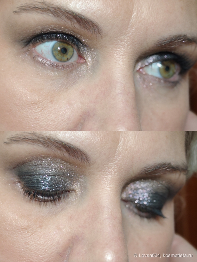 Что меня удивило и порадовало больше всего? То, что я могу взять чёрный матовый, покрыть его спарклом (или даже наоборот, нанести на спаркл!) и получить такой макияж, о котором всегда мечтала. Да, я искала тени, карандаши, что угодно, чтобы получить сверкающие чёрные веки, и оказалось, что в этой, простой на первый взгляд, палитре я нашла именно это, чёрное звёздное полотно!