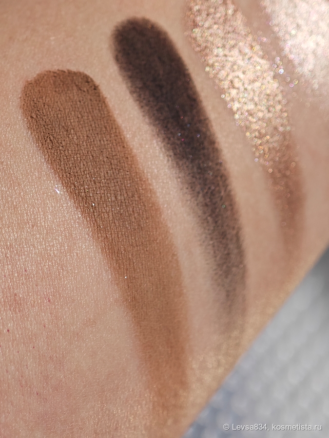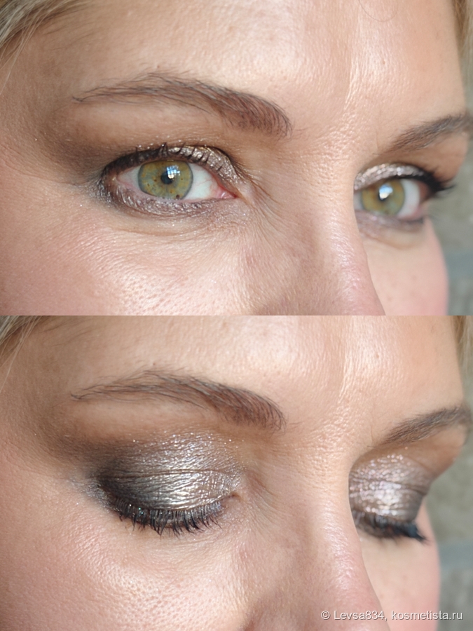 Авторы, задумавший эту палетку, разделили их на две зоны, одна для макияжа дневного, это светлый и серый стальной оттенки, и вторая для макияжей вечерних, в ней оказался металлик нейтрального коричневого оттенка (кстати, чёрный матовый тоже из этой вечерней зоны).