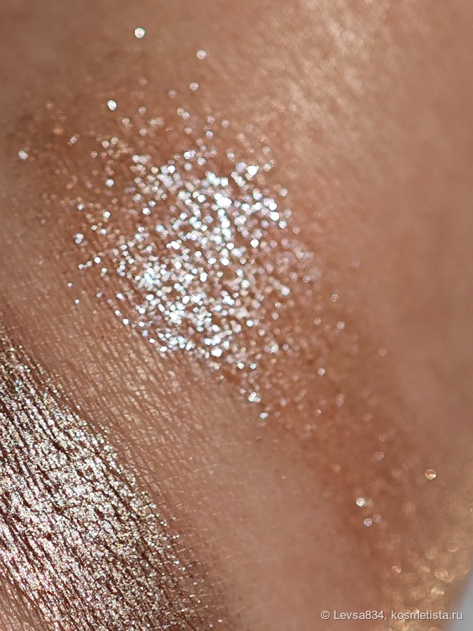 В рефиле он кажется светло-розовым, но на веке он превращается в серебристые искорки на прозрачной базе.