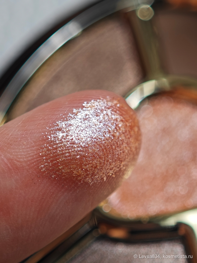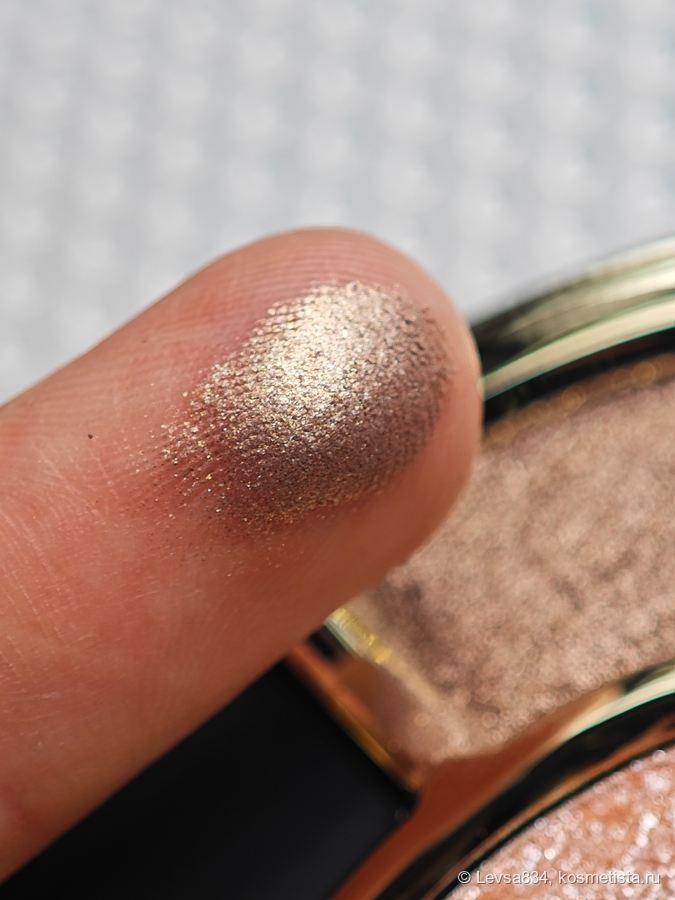 Я наношу его либо пальцем, и тогда он даёт влажный блик, либо кистью с ворсом-метёлкой (в таком случае при нанесении могут осыпаться на щёки несколько сверкающих частиц).
