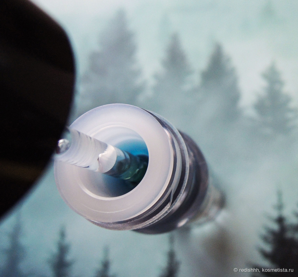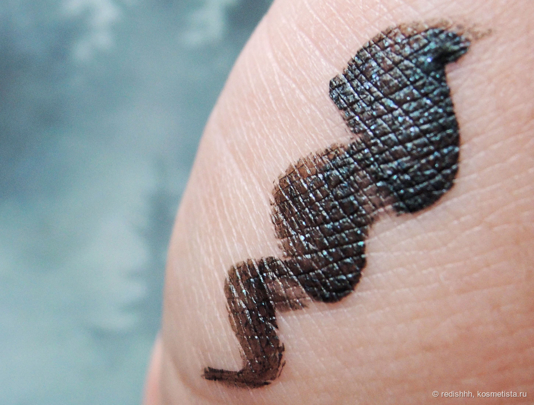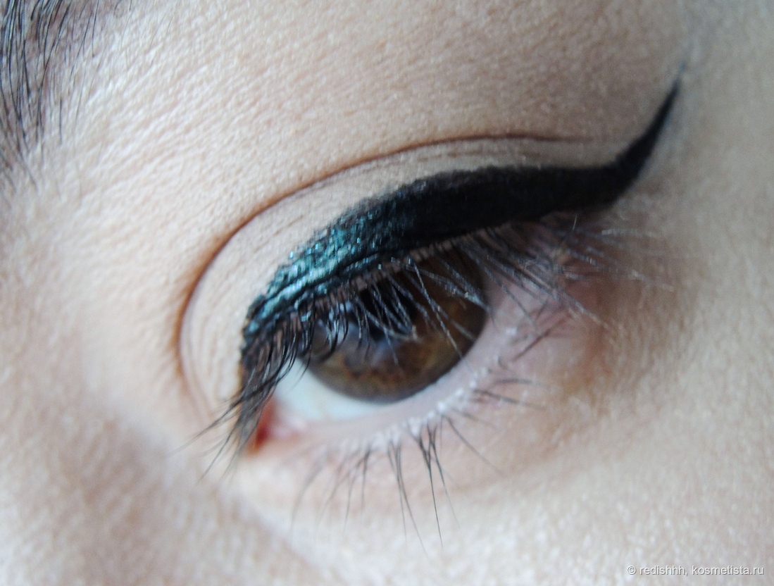 Зеленые всполохи можно уловить только под определенным углом. Подводка черная, с металлическим финишем. Но даже встряхивая ее постоянно, как того просит производитель, добиться результата как на промо-фото невозможно. Это будет относительно черный цвет с отдельными искорками зеленого. У меня подводка рисует плавно, но пигмента мне не хватает, и чтобы веко не просвечивало — приходится наслаивать.