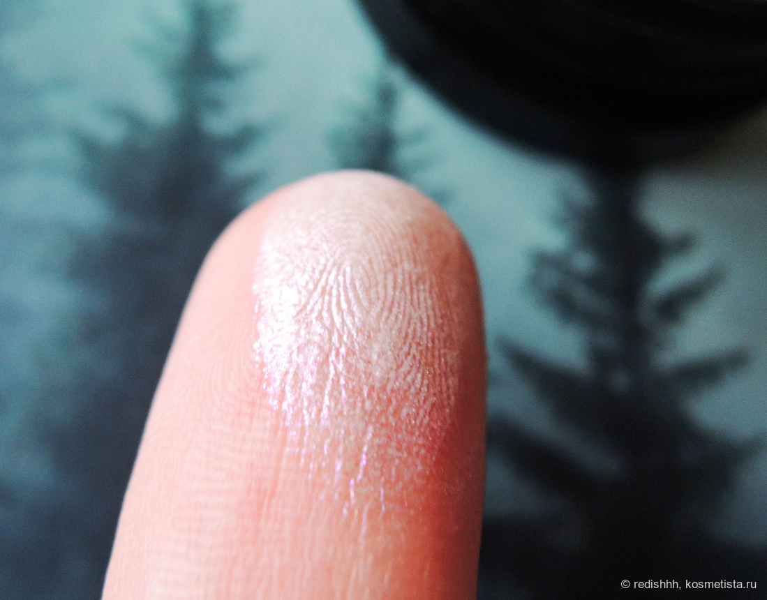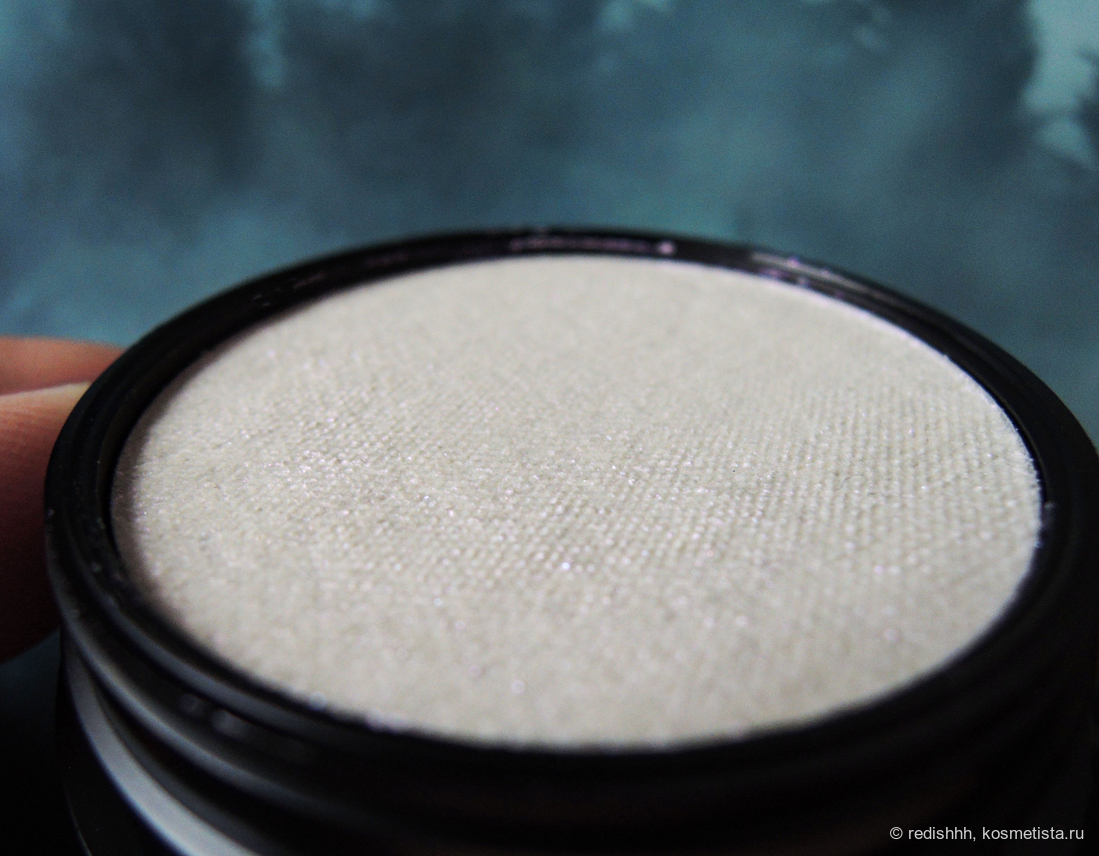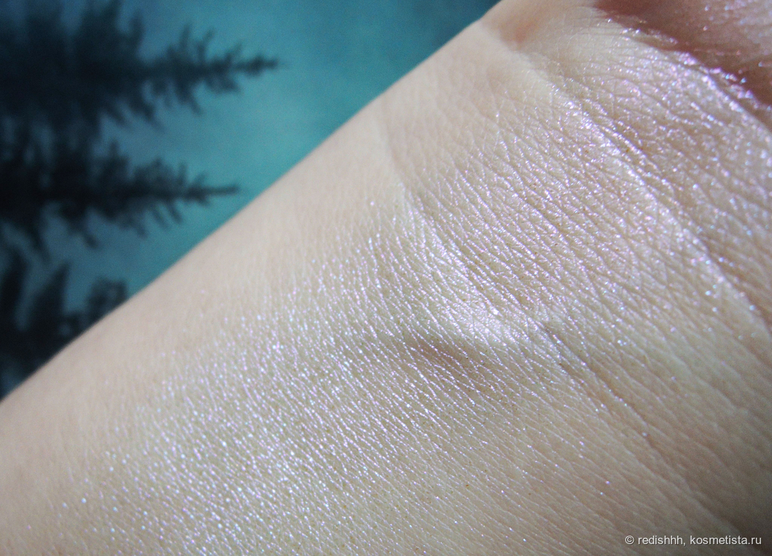 Хайлайтер кремово-пудровый, под пальцами ощущается достаточно силиконистым. Под прямым углом это жемчужный оттенок.