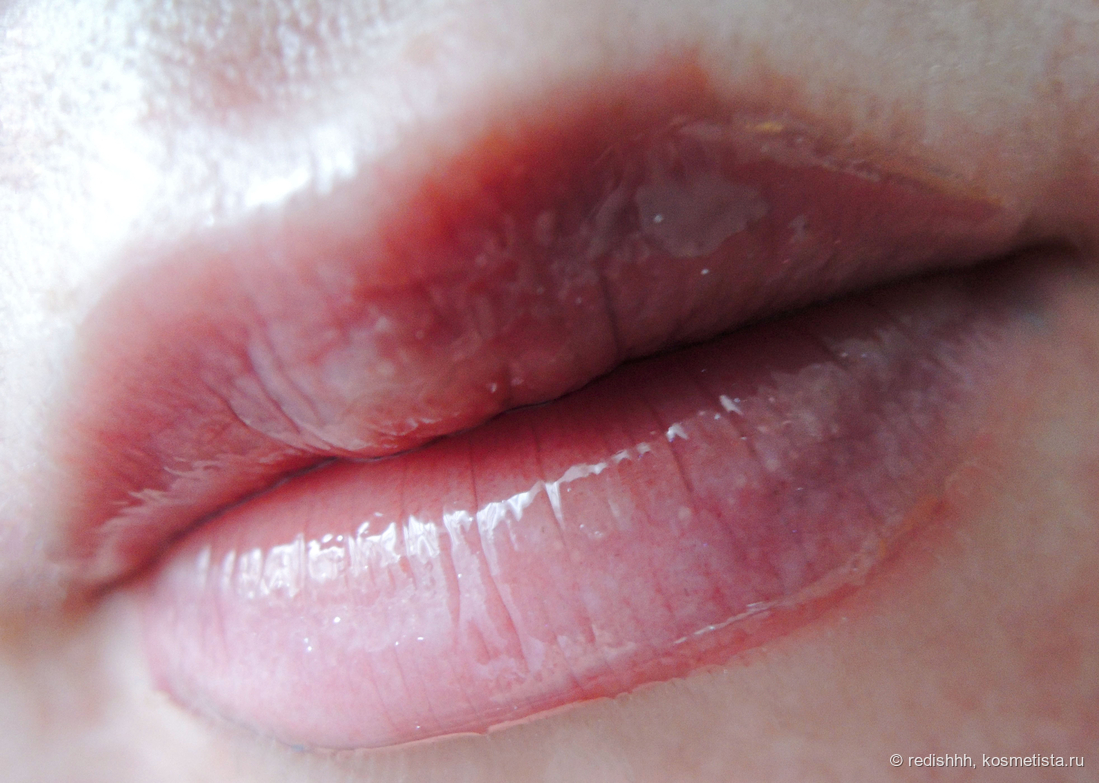 На губах их разглядеть можно только под определенным углом фотоаппарата. Я специально нанесла масло пожирнее, поэтому на фото ниже можно увидеть, небольшие затекания и комкования оттенка.