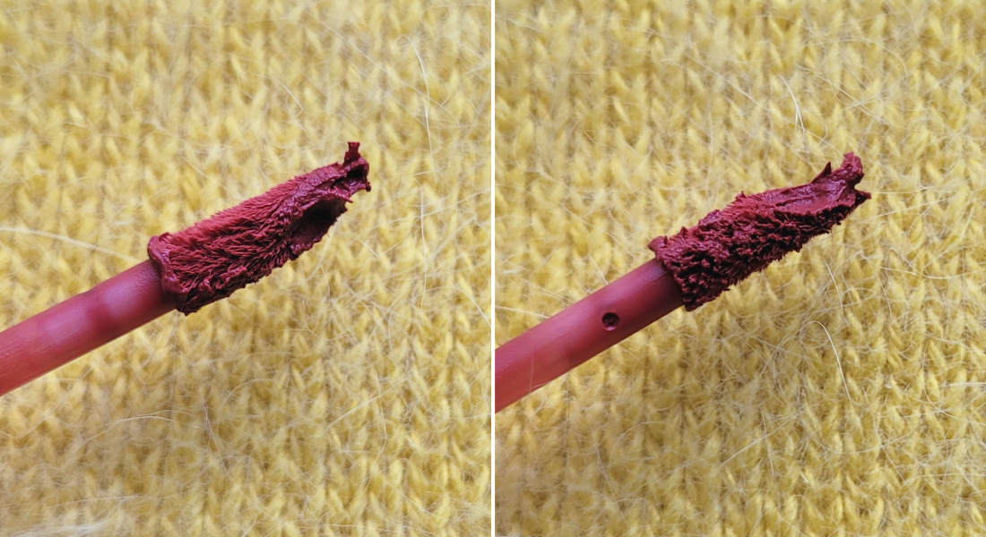 Аппликатор представляет собой ворсистую палочку со скошенным краем и углублением. Не смотря на всю мою любовь к продуктам марки, аппликаторы — это не их конек. По ощущениям это буквально палка. Только у их блеска нормальный человеческий аппликатор, а у матовых и глянцевых тинтов вот это вот недоразумение...