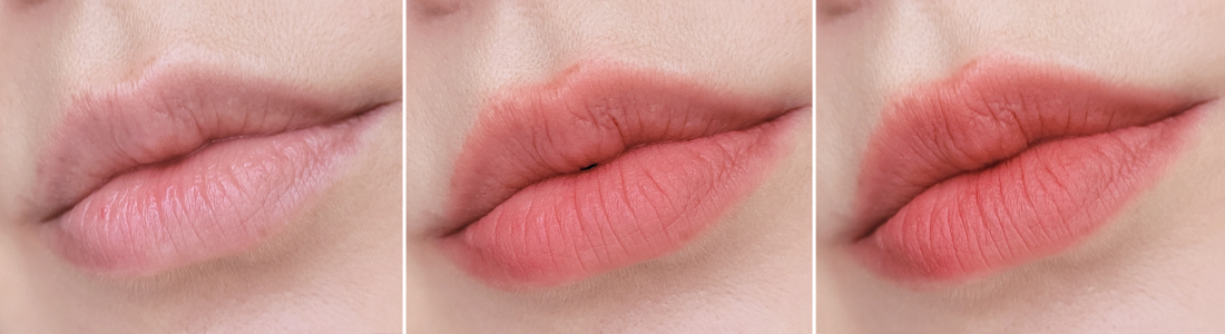 Небольшой коллаж для наглядности: голые губы => тинт в один слой => тинт в два слоя.