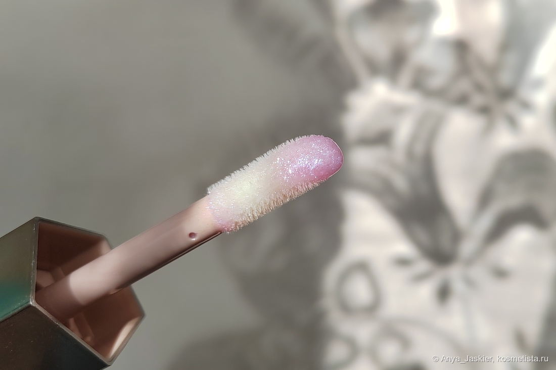 Блеск приехал в картонной коробке с ленточкой, чтоб можно было повесить на ёлку. Оформление неоновое, на обратной стороне напечатан состав всех слоев. Пятигранный пластиковый прозрачный флакон демонстрирует цвет содержимого, серебряная крышка закрывается с мягким щелчком (и собирает на себя отпечатки). На бутыльке информации минимум: название бренда, лого на крышке и наклейка на донышке. Спонж гигантский (сайт подсказывает размер XXL), но удобный, в форме скошенной лапки. Ограничитель выдает блеска на толстый слой — наносить тонкий кажется кощунством. Бренд предлагает использовать 9 мл продукта за 12 месяцев — наверное, если пользоваться только им несколько раз в день, то за год закончить получится. Произведен в США, пометки vegan и cruelty free нашлись на сайте.