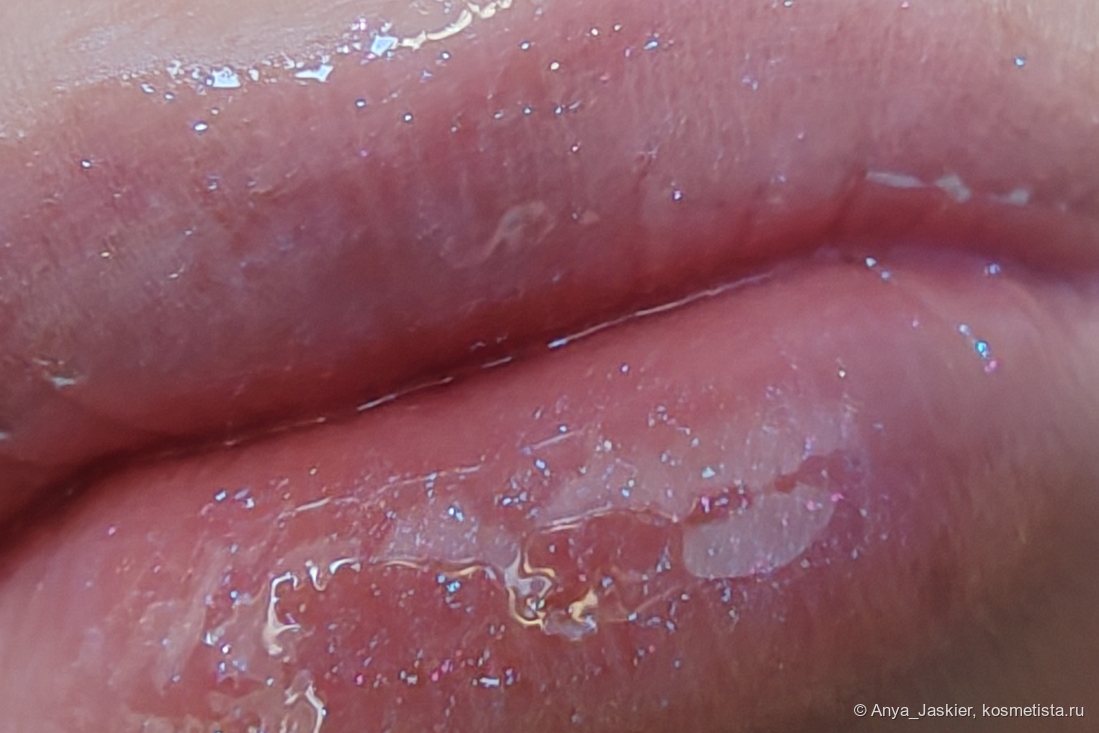 По текстуре gloss bomb густой и плотный, ощущается на губах, но не убегает за контур. Липкость умеренная, хотя волосы приклеиваются на ура, да так на блеске и остаются. Стойкость отменная, глянец спокойно держится несколько часов. Перекусы выдерживает с достоинством: отпечатываясь на всех соприкасающихся поверхностях, практически не теряет своего присутствия на губах. Мне очень нравятся ухаживающие свойства — после снятия блеска губы становятся мягкими, как после бальзама. Но ложкой дёгтя в этой девятимиллилитровой банке мёда для меня стал приторно-сладкий навязчивый персиково-ванильный аромат. Он не настолько химозно-противный, что не хочется носить, но ощущается всю дорогу, если не носом, то на вкус. В общем, жить можно, но лучше было бы без аромата (или приглушить отдушку раз в пять). И флакон бы поменьше. И цену соотвественно.