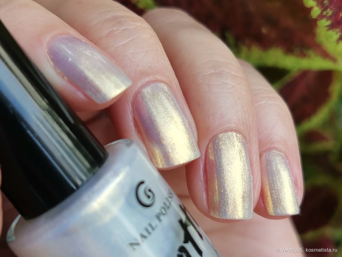 На сайте этот лак описывают как полупрозрачный оттенок серо-голубого подтона с рассеянным золотисто-зеленым шиммерным сиянием. Но зеленого я не вижу — вижу золото.