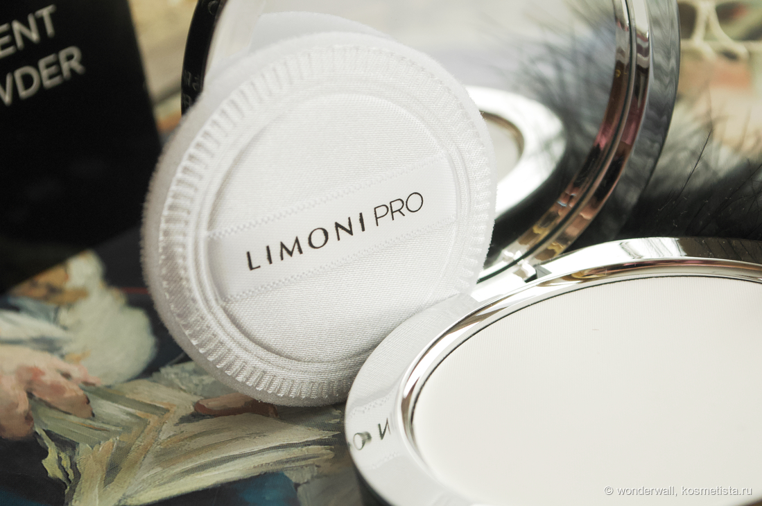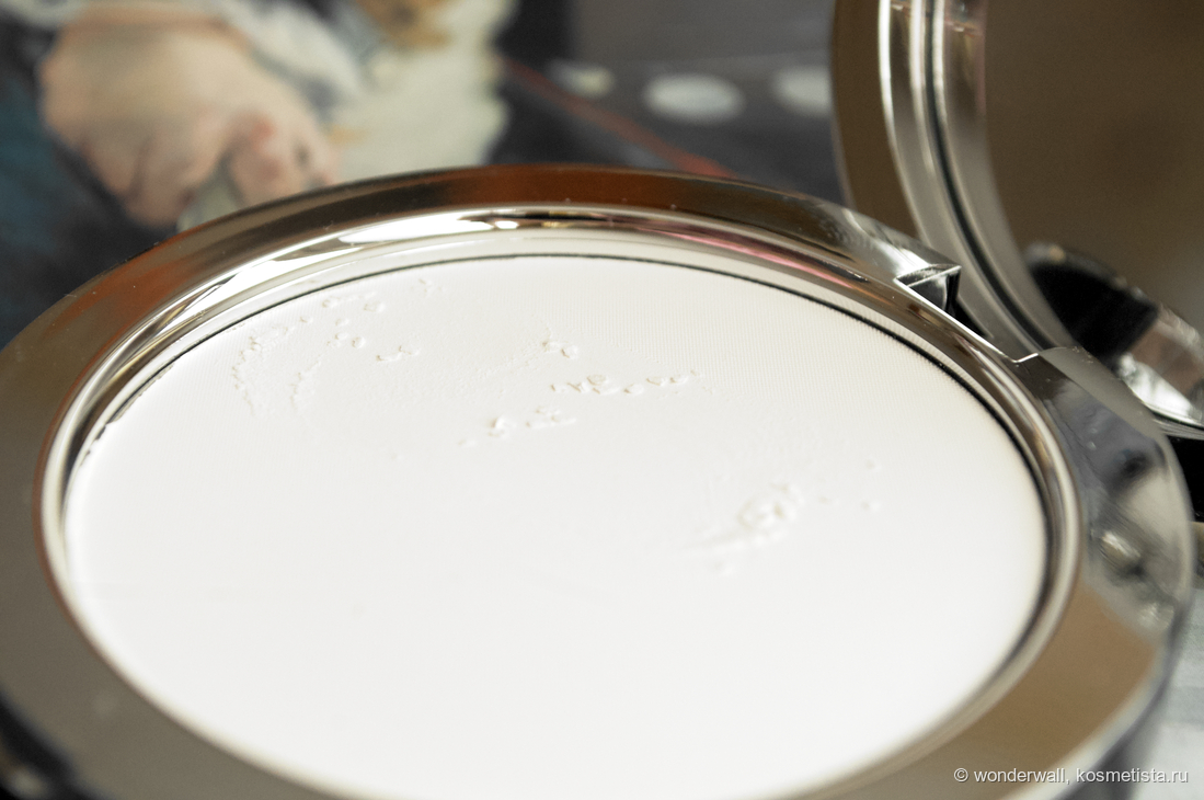 Внутри находится довольно странный спонж, частично сделанный из бумаги. При нанесении пудры он издаёт характерные шуршащие звуки. Но с поставленной задачей он справляется и распределяет текстуру по коже довольно тонким слоем.