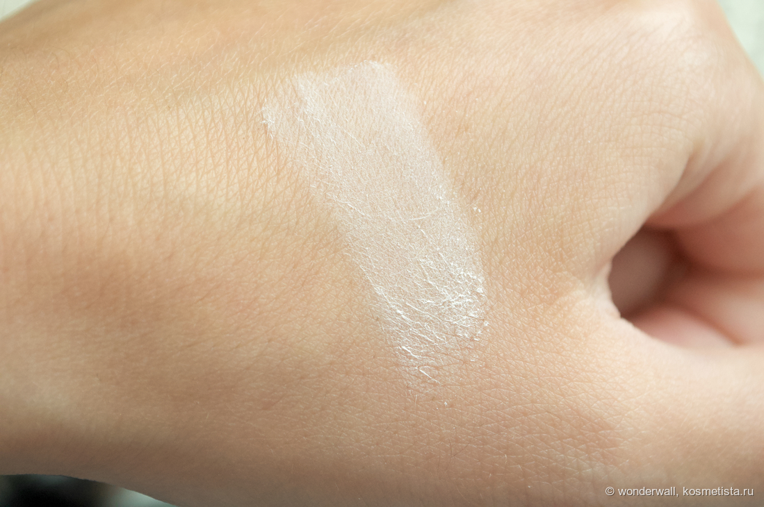 На свотче заметна сухая текстура пудры. Оттенок на выходе получается прозрачным, хотя на руке пудра выглядит белоснежно: