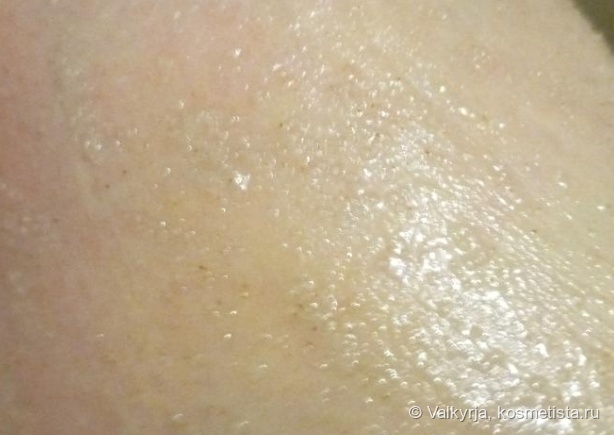 Скраб, как я говорила, не сильно жёсткий, но массаж с ним приятен. Чувствуется, что кожа хорошо отшелушивается от всего ненужного, и очищается. После применения она гладкая, мягкая и безумно приятная тактильно! Но скрабами я пользуюсь преимущественно утром, и вот то количество масла, чит. Гидрофобной плёнки на коже после смывания — мне не нравится. Мне не нравится ни трудности со смыванием, ни ощущение будто я шпротина из банки с маслом… Брр.