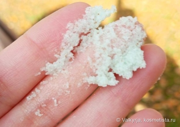 Этот скраб напоминает мне мороженое! Но по текстуре больше похож на миллион сахарных частиц в баттере. Однако, на руке излишней маслянистости не ощущается. Скрабирующие частицы мелкие, кожу не царапают, по уровню жёсткости — 3/5.
