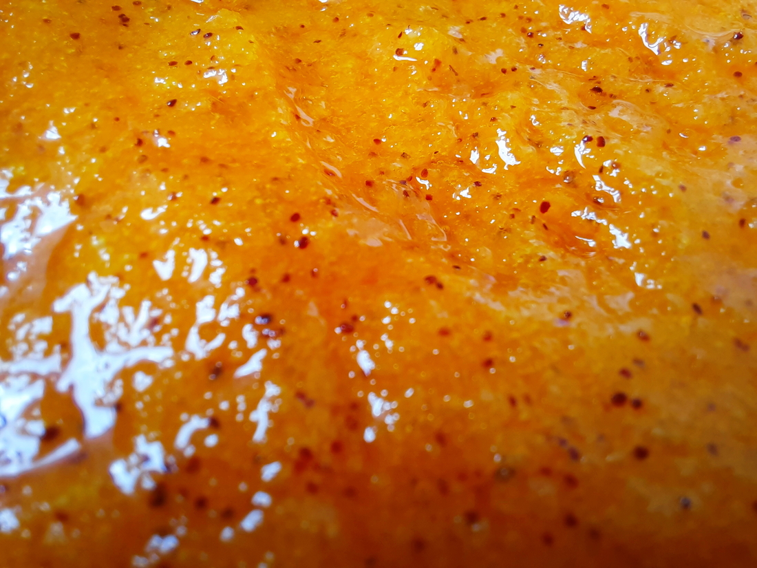 Под мембраной из пластика сахарно-солевое содержимое: скраб оранжевого цвета с вкраплениями порошка абрикосовых косточек.
