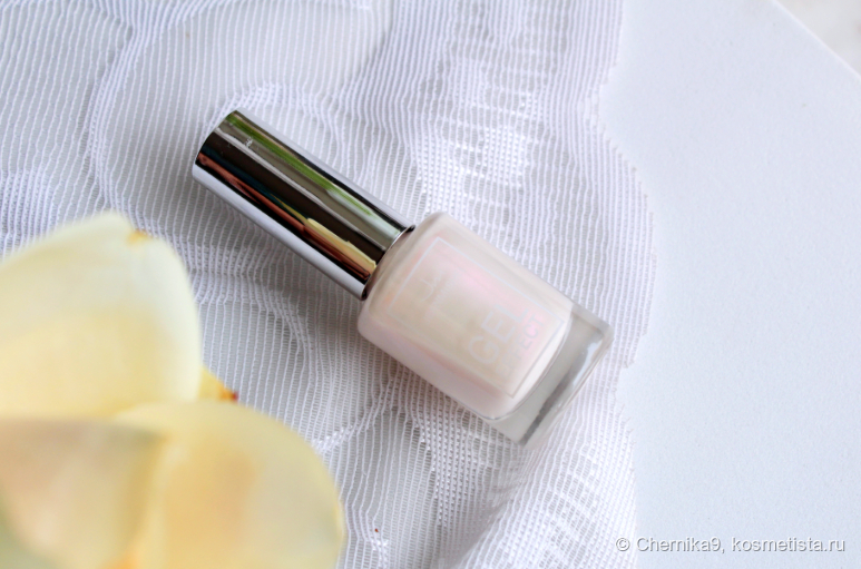 Глядя на флакон, кажется, что лак практически белый, но это иллюзия. На самом деле в нём есть едва заметный розоватый оттенок, который смотрится красиво и добавляет изюминку маникюру. В более тёмном пасмурном свете он создаёт эффект искры, приятного отсвета. Глядя на него, даже в пасмурный день кажется, что где-то сверкнуло солнце.