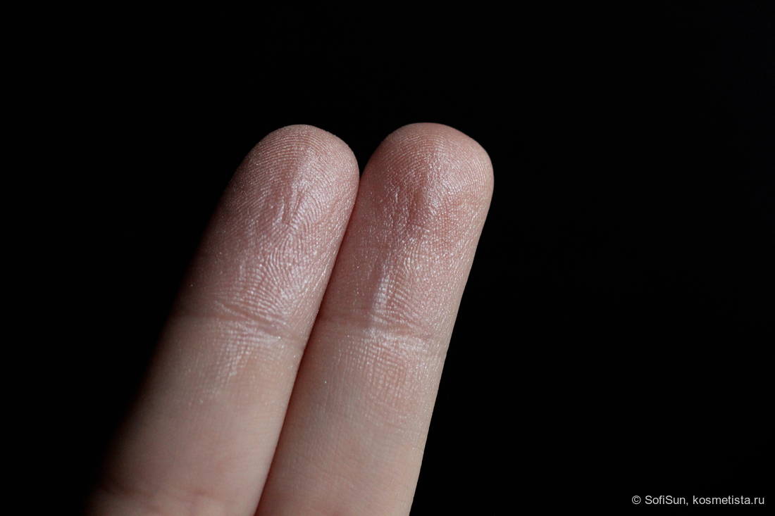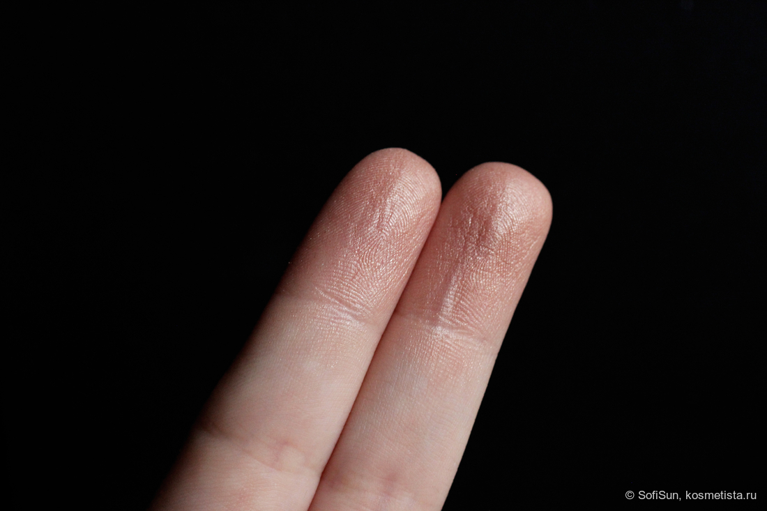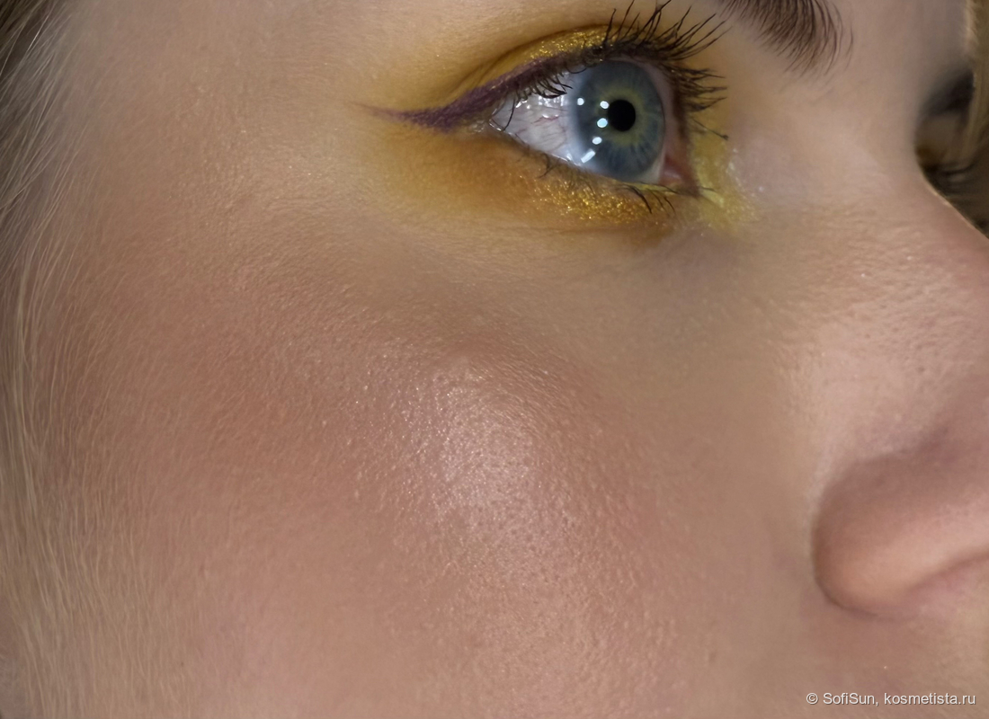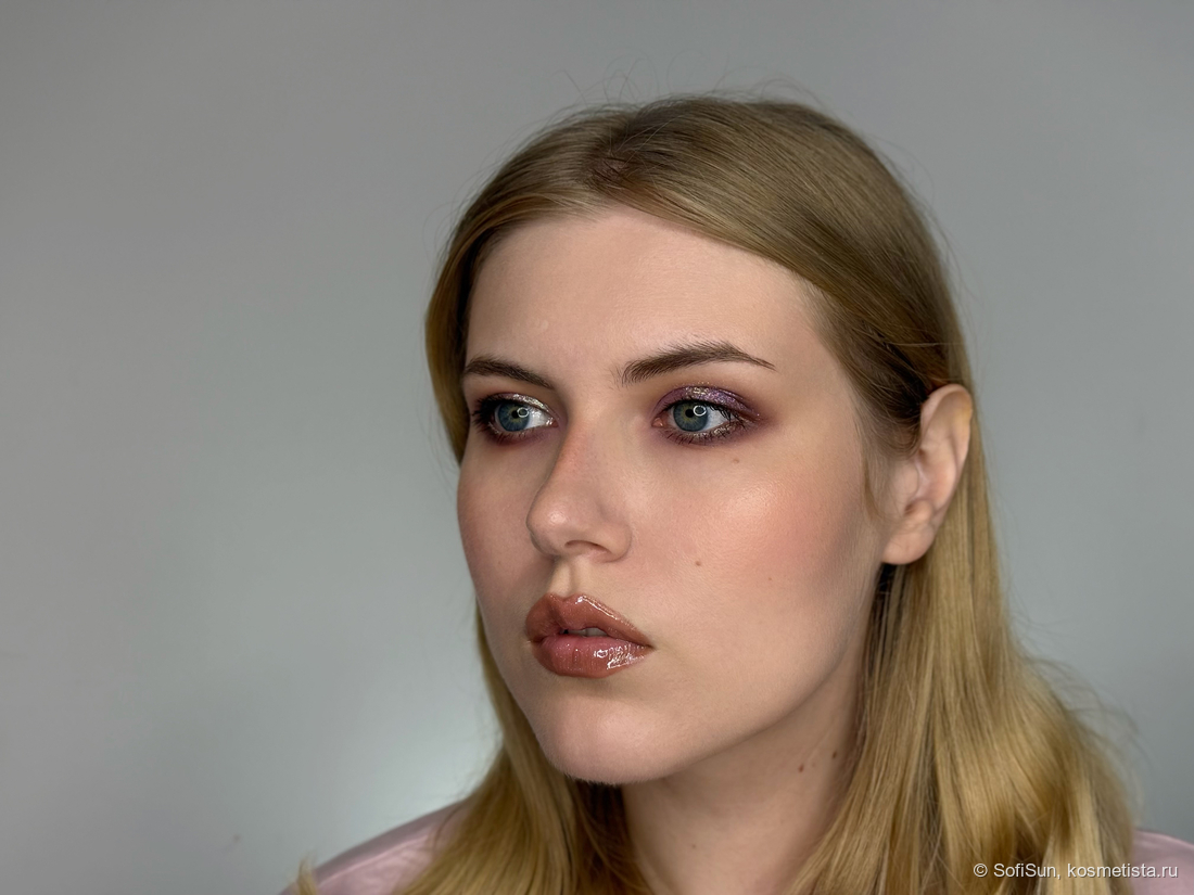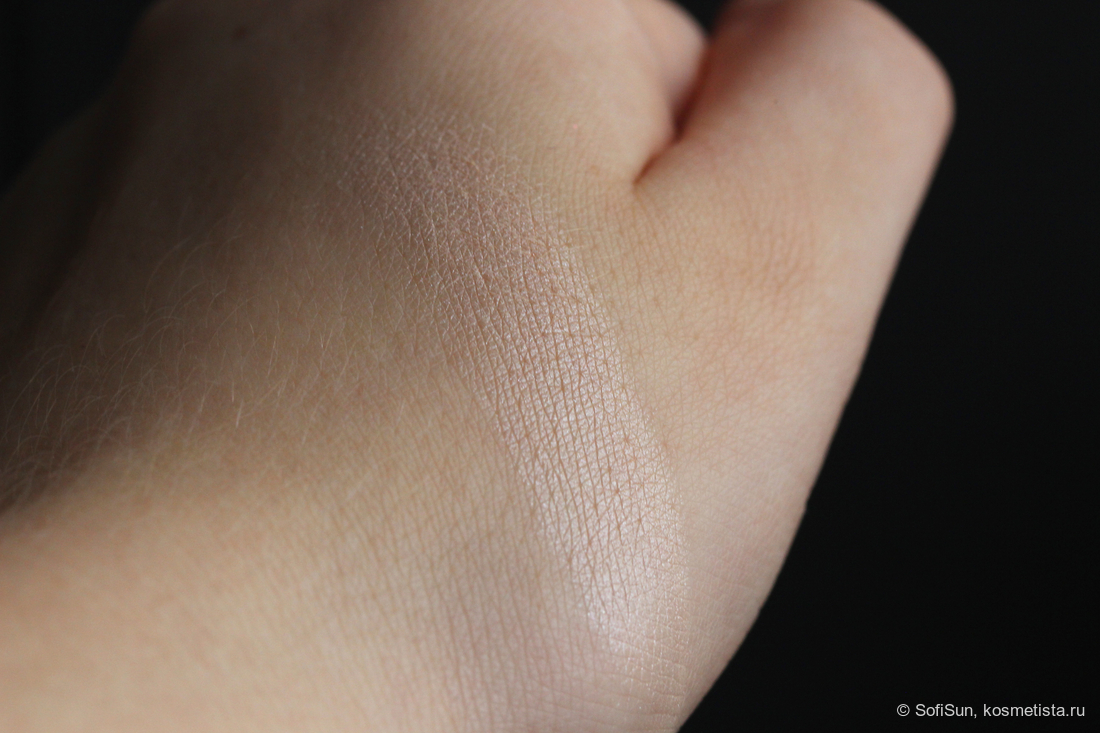 Хайлайтер мне безумно понравился. У него прохладный блик, но он не белый, не желтоватый — что-то между. На бледной коже и холодном подтоне смотрится невероятно органично. Ложится нежно, красиво заполировывается в кожу, можно сделать и яркий блик.