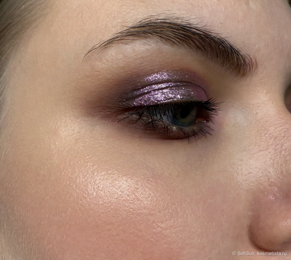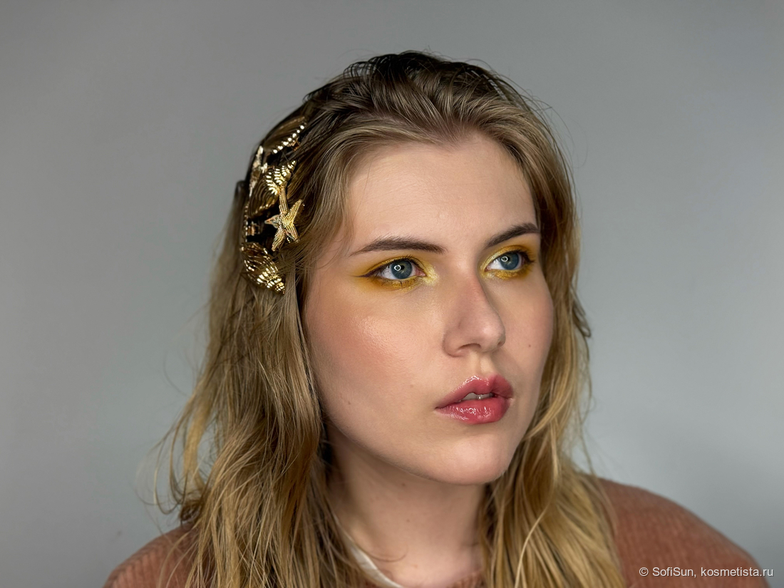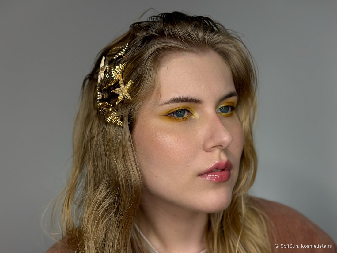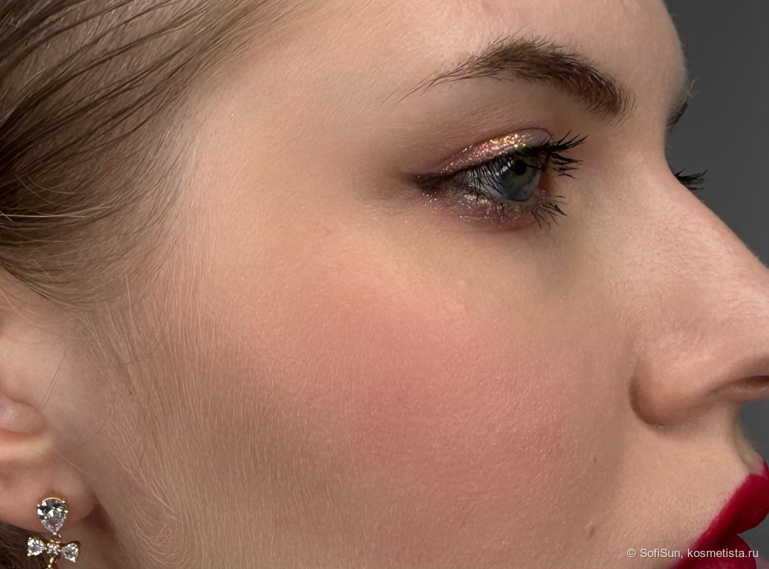 Хайлайтер мне безумно понравился. У него прохладный блик, но он не белый, не желтоватый — что-то между. На бледной коже и холодном подтоне смотрится невероятно органично. Ложится нежно, красиво заполировывается в кожу, можно сделать и яркий блик.