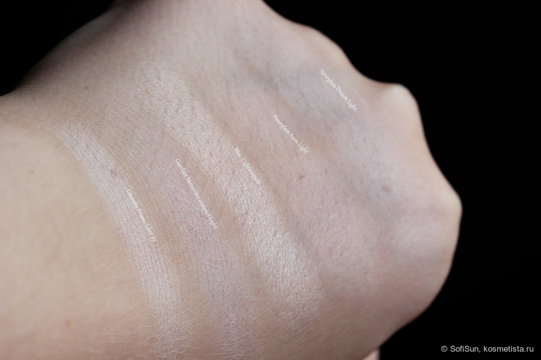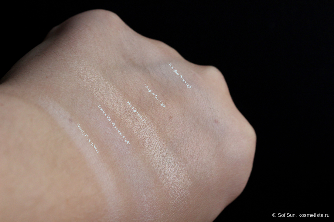 Я сделала сравнение со всеми моими подсвечивающими пудрами. У Hourglass сияние, примерно, среднее: MAC — самая сияющая, Givenchy — самая матовая.