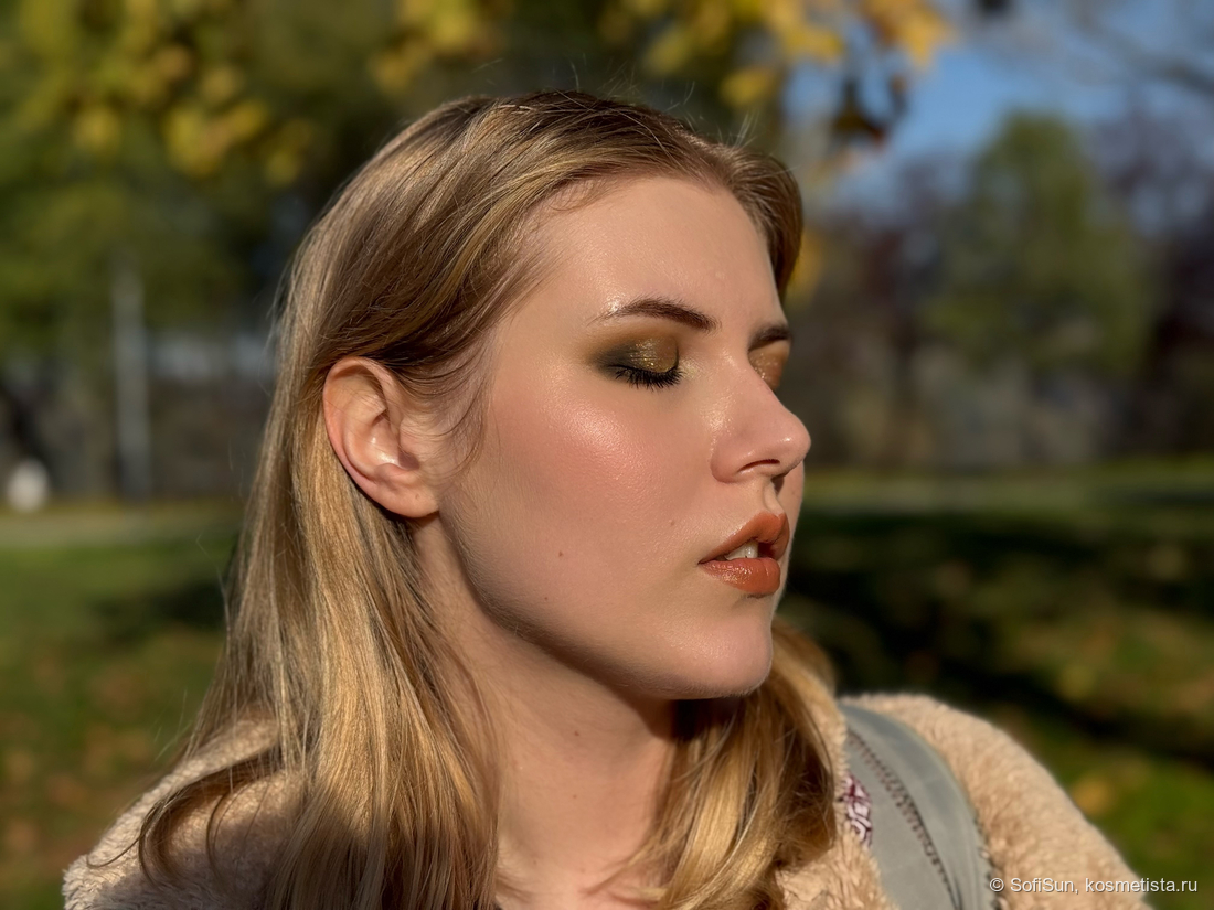 Второй макияж. Персиковые румяна, хайлайтер и Aura Light. Образ получился тёплым, осенним и очень сияющим.