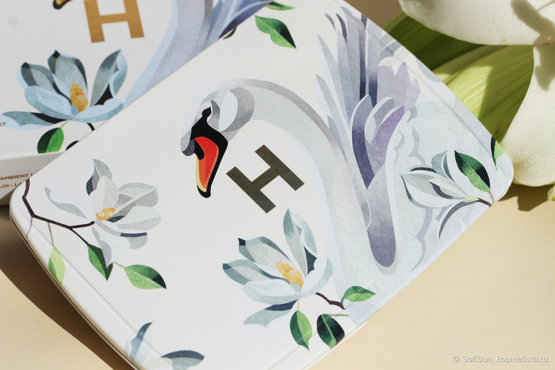 Дизайн и упаковка. Палетка приходит в плотной картонной коробке, повторяющей дизайн футляра. На обороте есть описание каждого рефила и состав. Сама палетка выполнена из металла — для меня это огромный плюс, я очень люблю, когда у люкса металлическая упаковка. Пластик в люксе я почему-то воспринимаю несерьёзно. Лебедь на фото показался просто милым, но вживую рисунок очаровательный. Передана фактура акварельной бумаги, видны разводы акварели, невероятно эстетично.