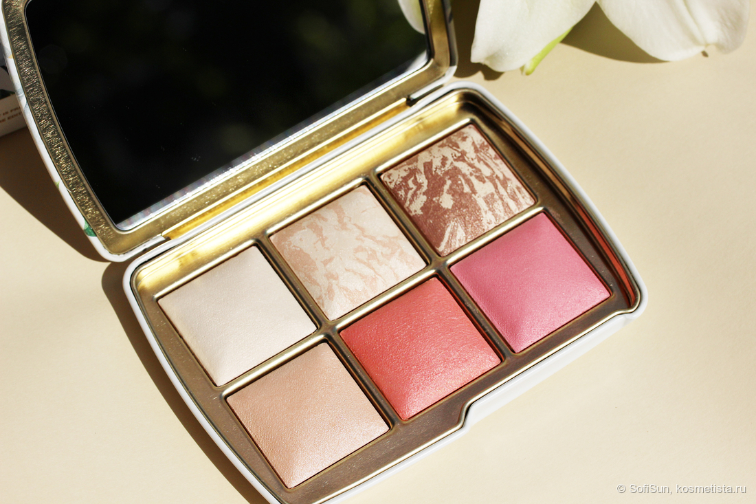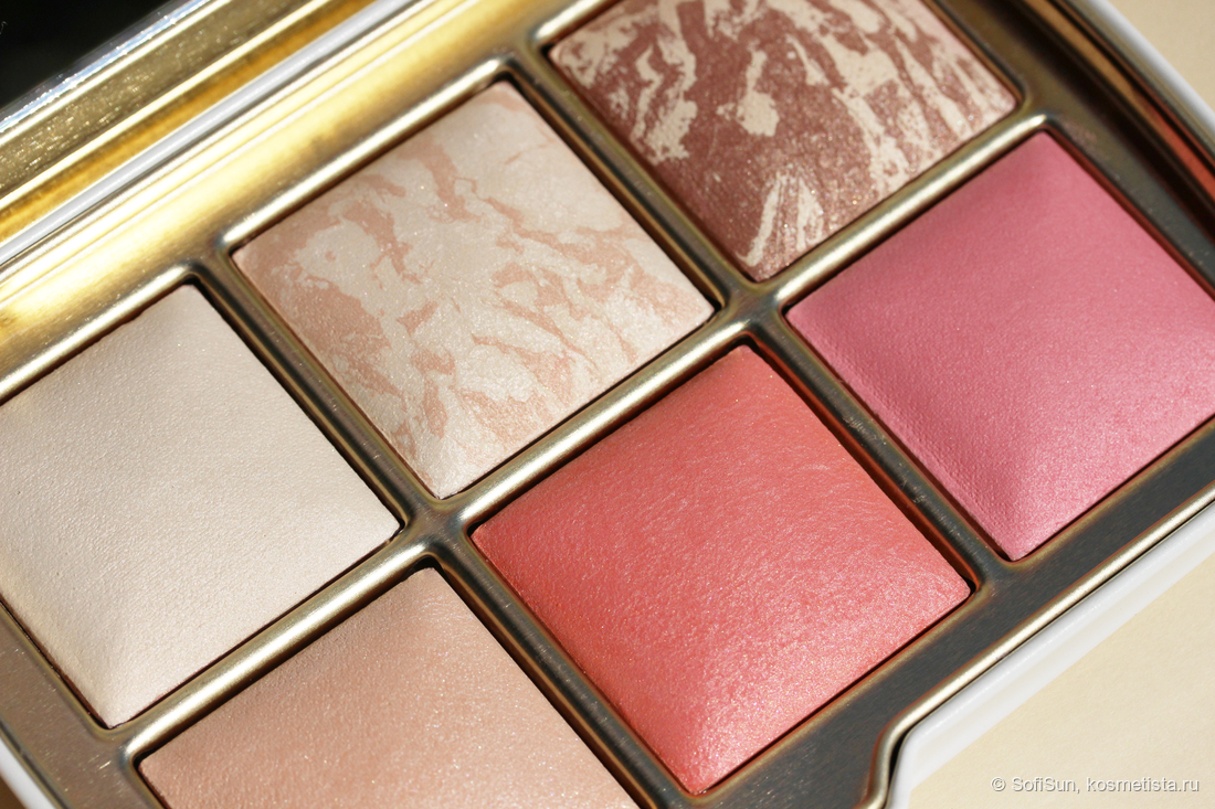 Внутри шесть рефилов: две подсвечивающие пудры, двое румян, бронзер и хайлайтер.