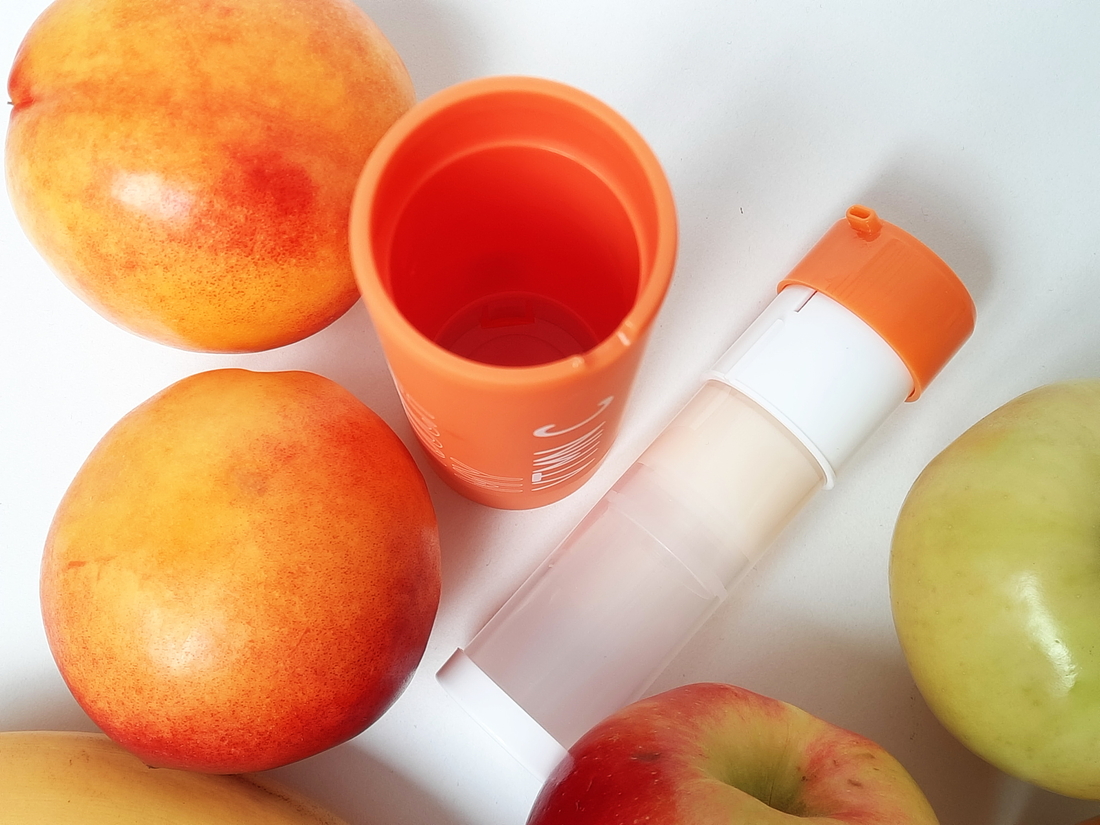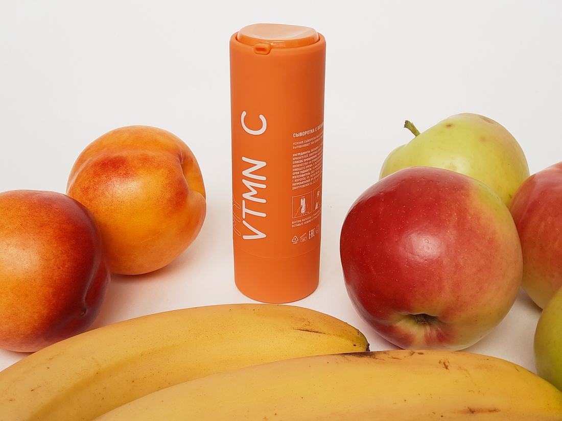 Сыворотка для лица Don't Touch My Skin VTMN C находится в ярком оранжевом цилиндрическом флаконе с крутящимся основанием, которое открывает доступ к дозатору — удобно, гигиенично и современно.