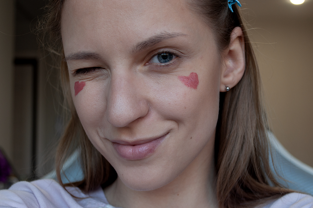 На лице цвет изображает смесь естественного загара с румянцем, как будто я немного обгорела на солнце. Мне нравится такой эффект. Тут я растушевала сердечки с прошлой фотографии, остатками на кисти чуть тронула переносицу. Ну красота же?