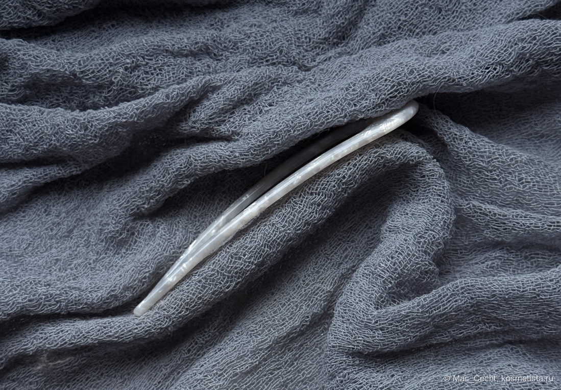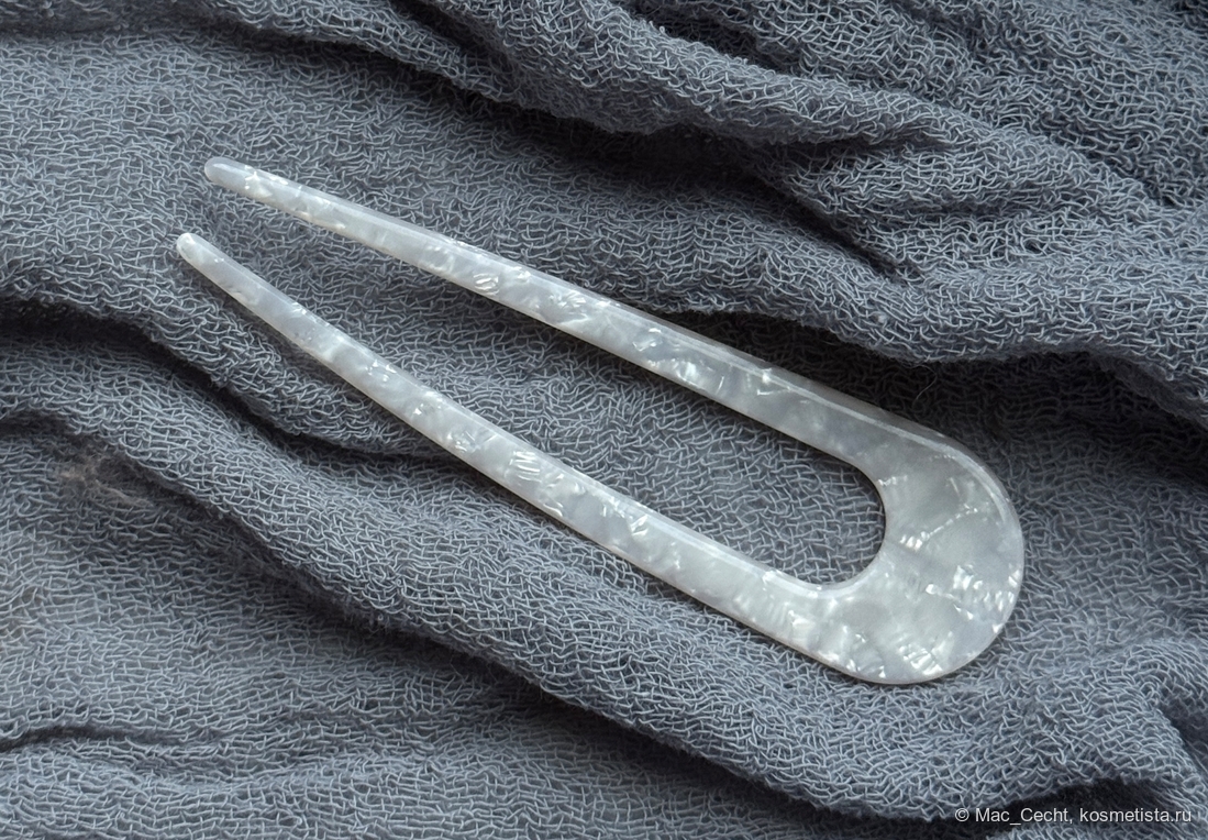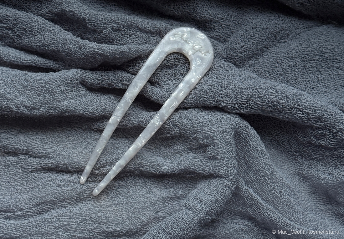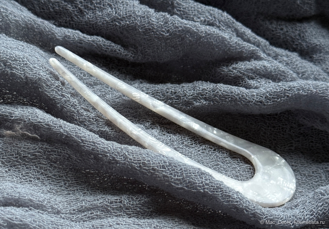 Заколка сделана из бело-перламутрового замеса, сверху логотип бренда. Цвет называется «жемчуг». На сайте выглядит более желтоватой, в реальности белее.