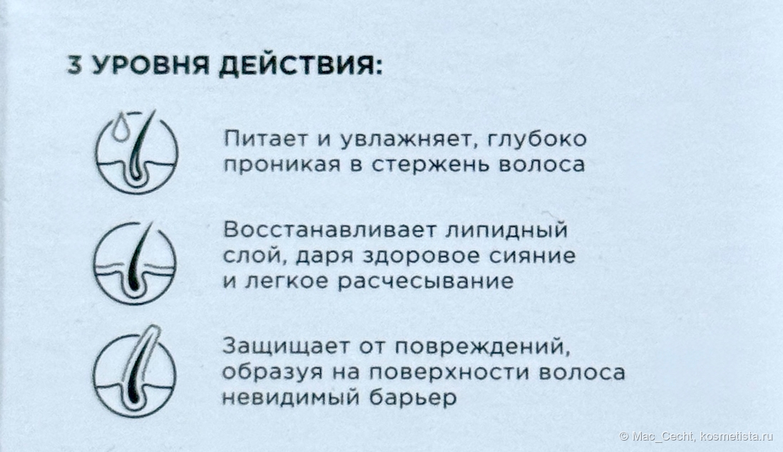Маска очень быстро впитывается волосами. Настолько, что это первый продукт, который мне приходится наносить порционно. Я не могу, как обычно, растянуть маску сразу по всем волосам, она на первой трети уже впитывается, и тянуть нечего. Я наношу порциями в три захода.