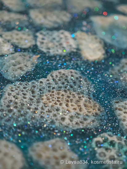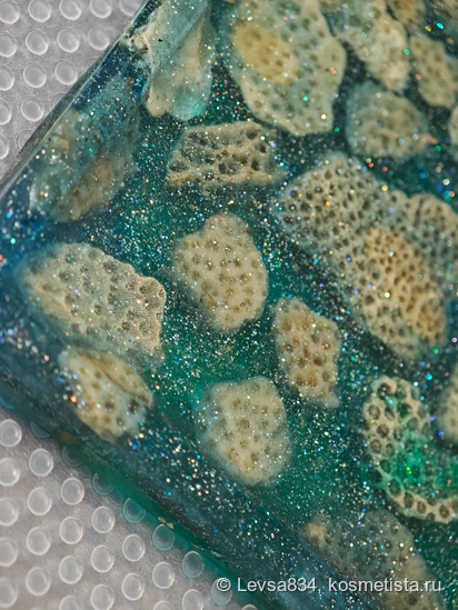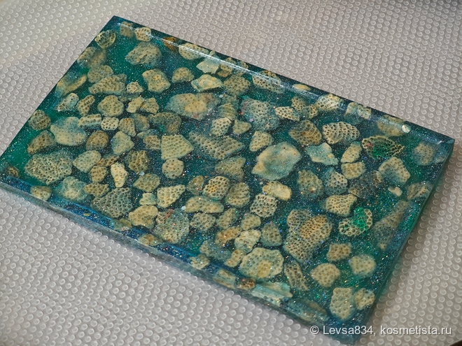 Дизайн довольно простой, и вместе с тем приятный, кораллы на фоне голубой бездны моря. Я не придумываю, я отчётливо это море вижу. У меня даже фоном нашёлся поднос, который я вот этими руками своими сделала, и кораллы в нём самые натуральные, карибские. Отбирала их сердцем, честно. Собирала руками, изнывая от зноя. Нет, нет, дразниться я даже не думала.