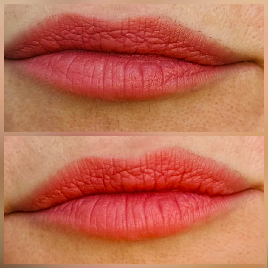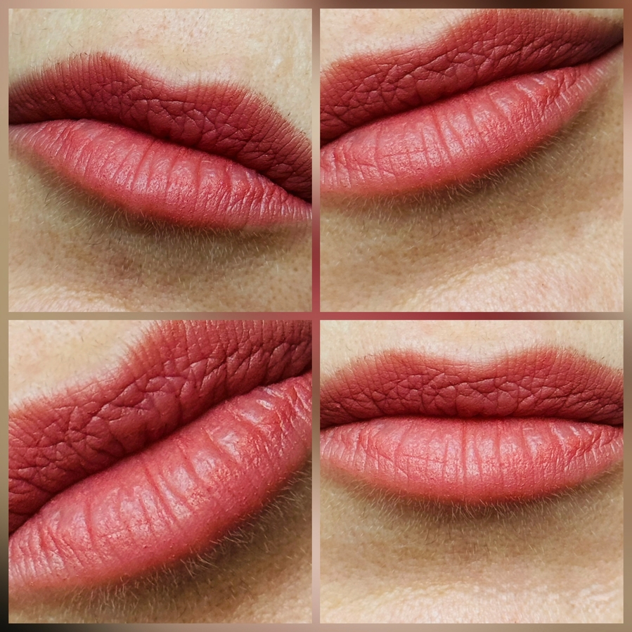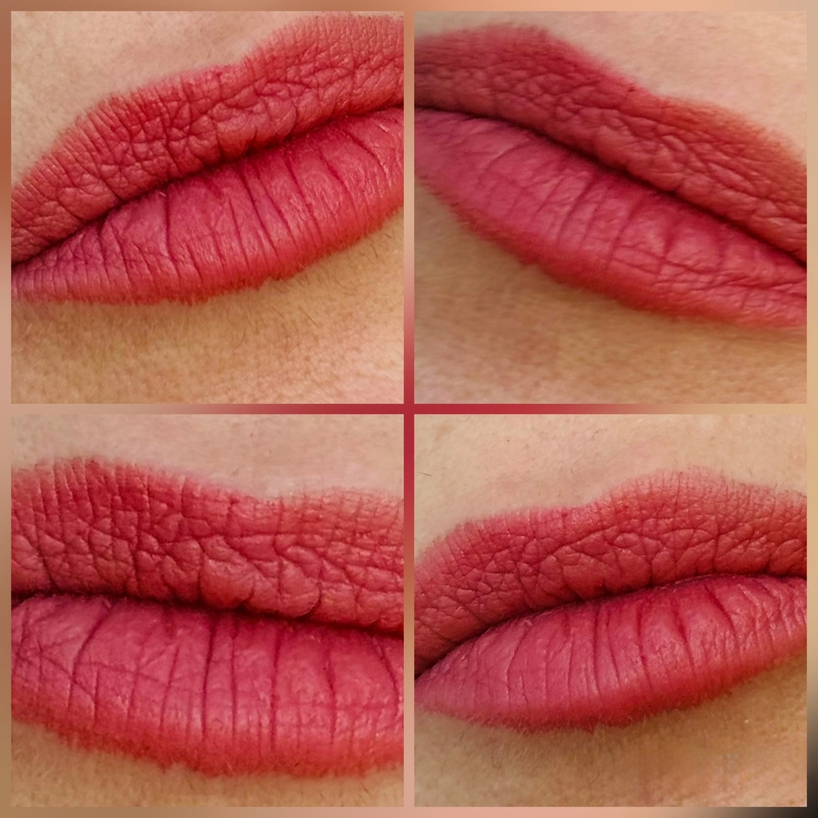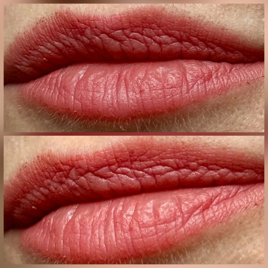 При этом помада хорошо держится на губах. Даже растушеванный вариант, с учетом какого-то легкого дневного перекуса, остается у меня с утра до вечера. Конечно уже немного подстертая, но, учитывая её специфику, это во-первых, не бросается в глаза, а во-вторых, губы не выглядят абсолютно пустыми и бесцветными.