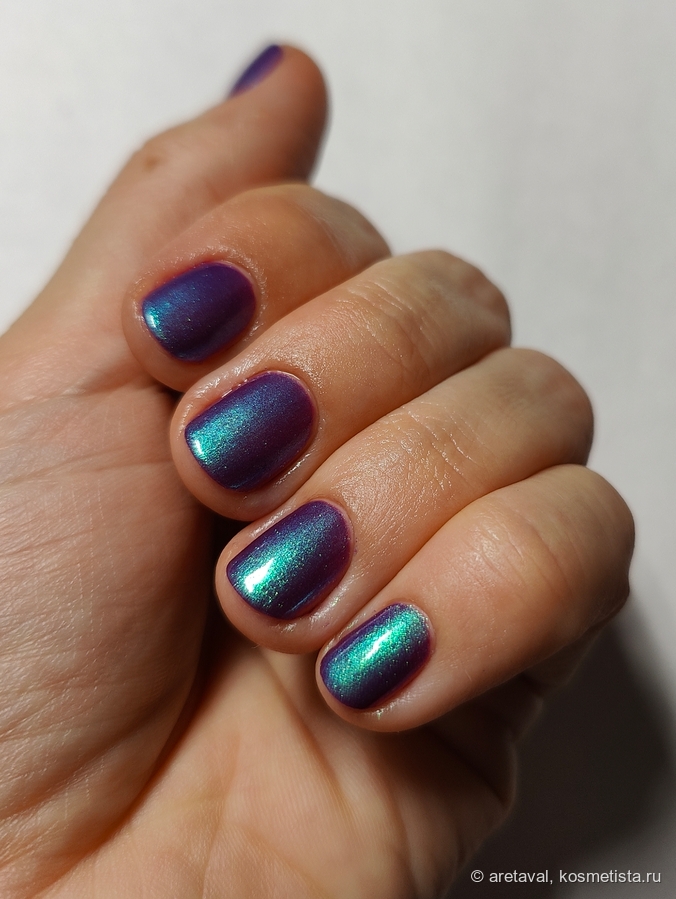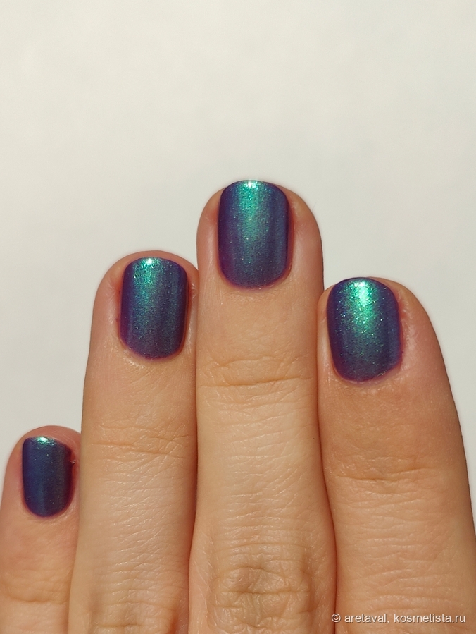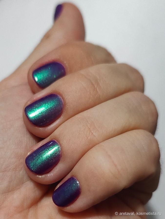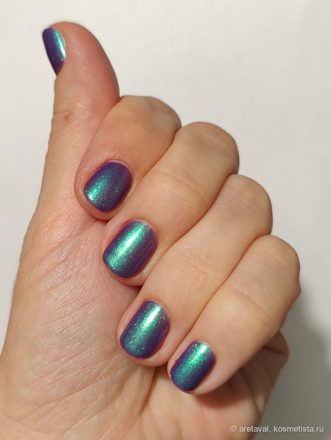Если смотреть на лак прямо, то он зелено-бирюзовый (но это хуже всего ловится на камеру), под углами он синий или цвета морской волны. Ну и фиолетовая база всегда видна.