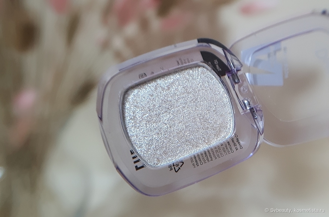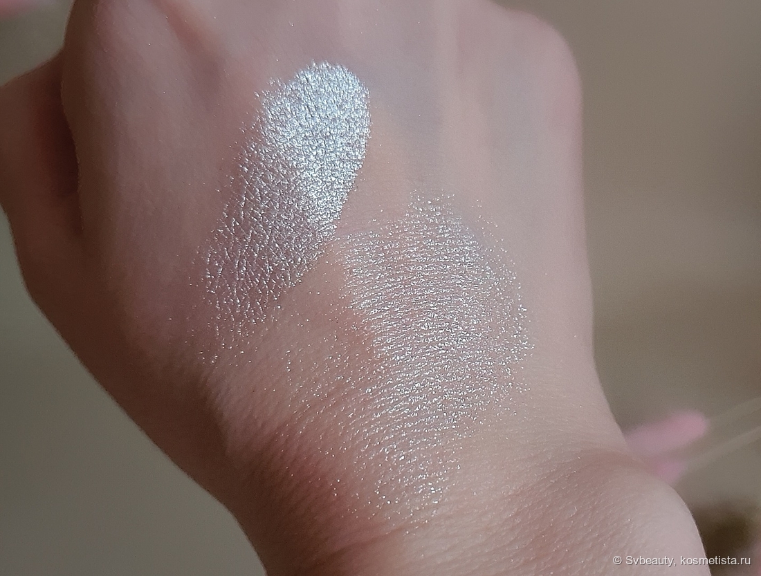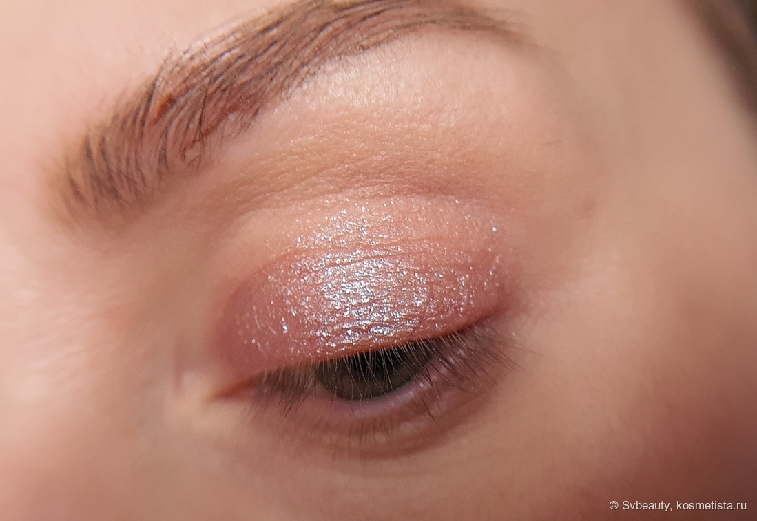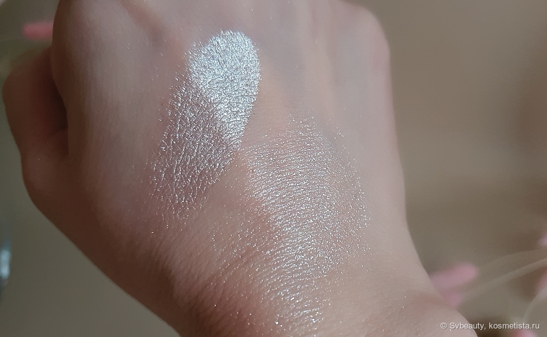 Если нанести плотно, причем тени настолько пигментированы, что плотное покрытие образуется в одно касание, то действительно появляется белая сверкающая с влажным эффектом гладь.