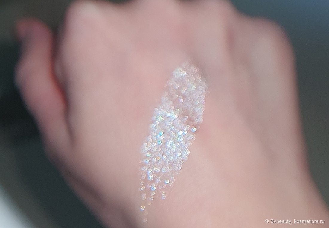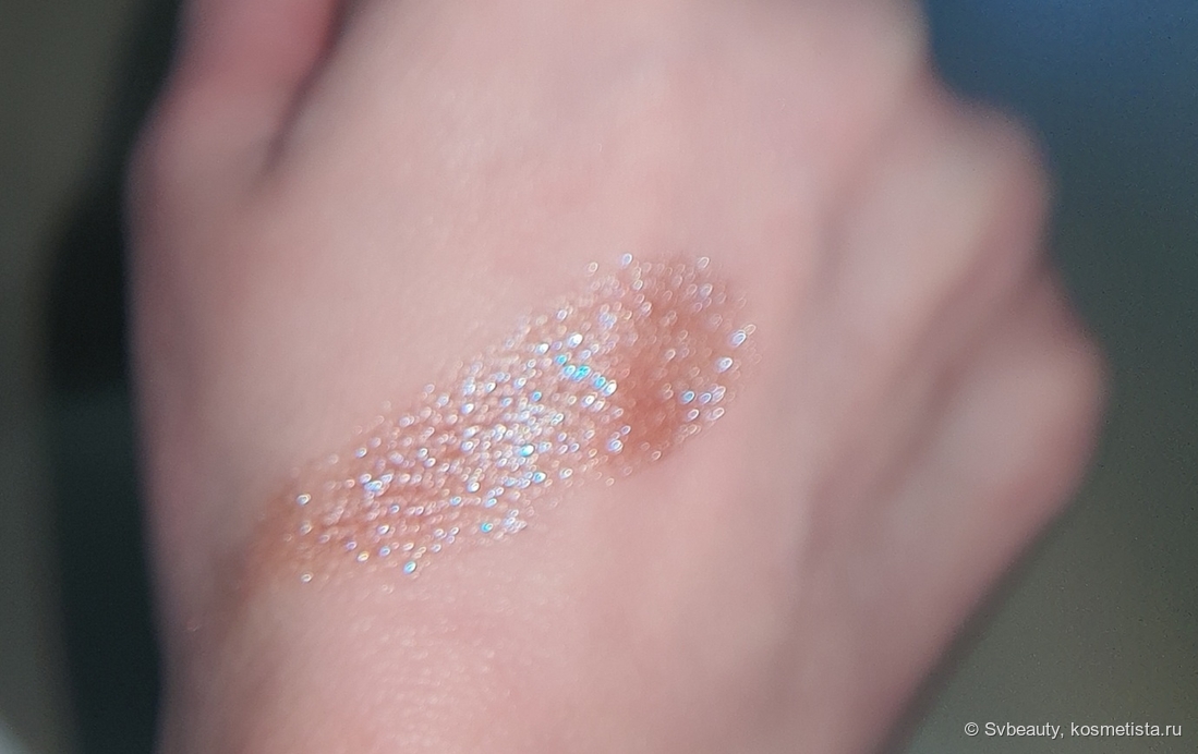 Однако основа на свотчи на руке и веках действительно розовая. Для меня этот оттенок представляет собой полупрозрачную розовую, все же с легкой коричневинкой подложку, с множеством разноцветных блесток. Особенно выделяются голубые и фиолетовые блестки.