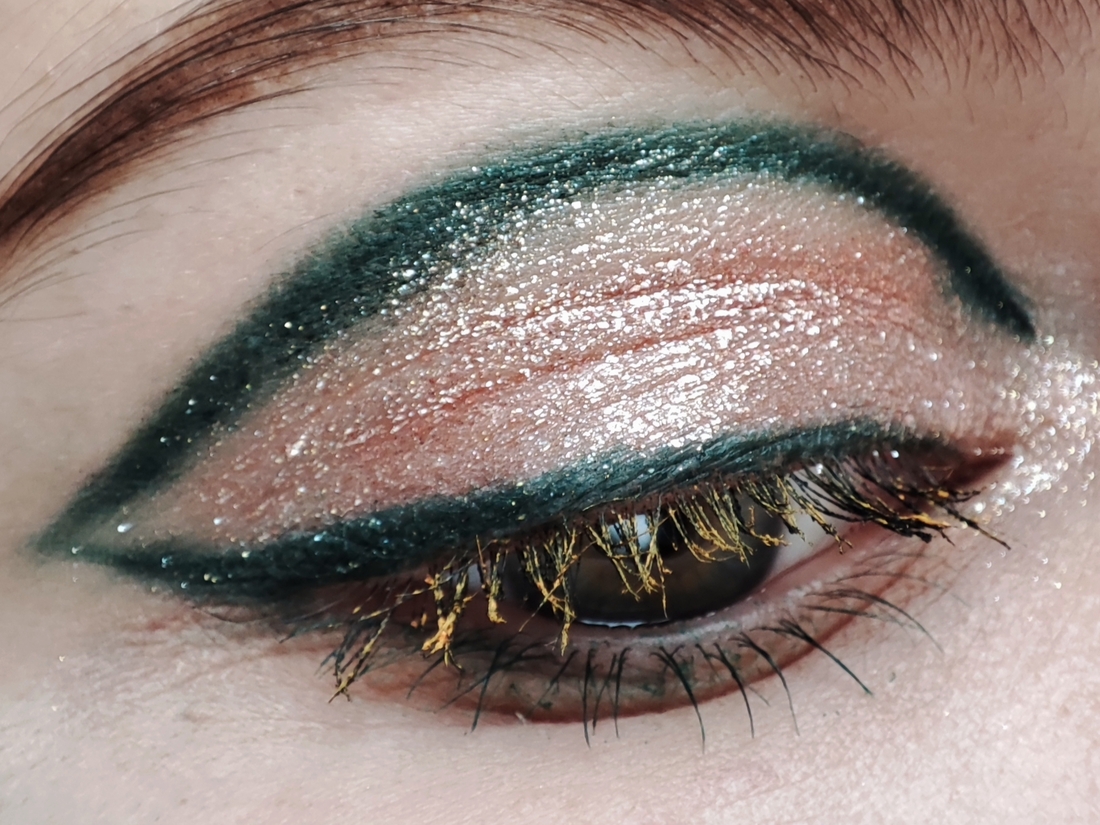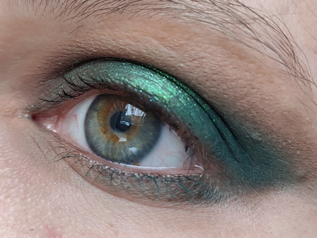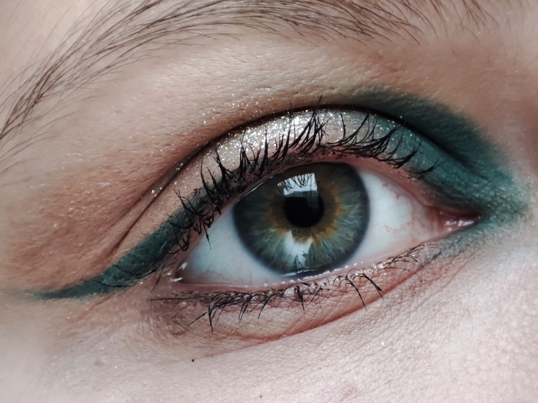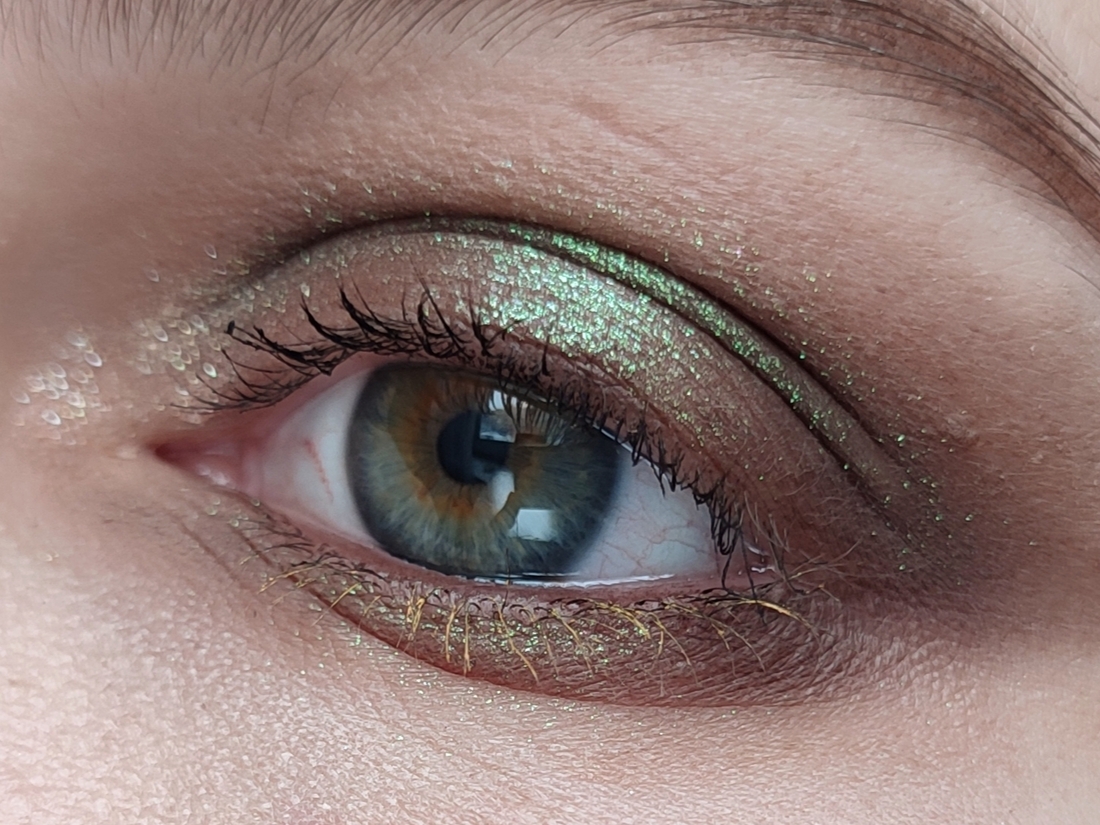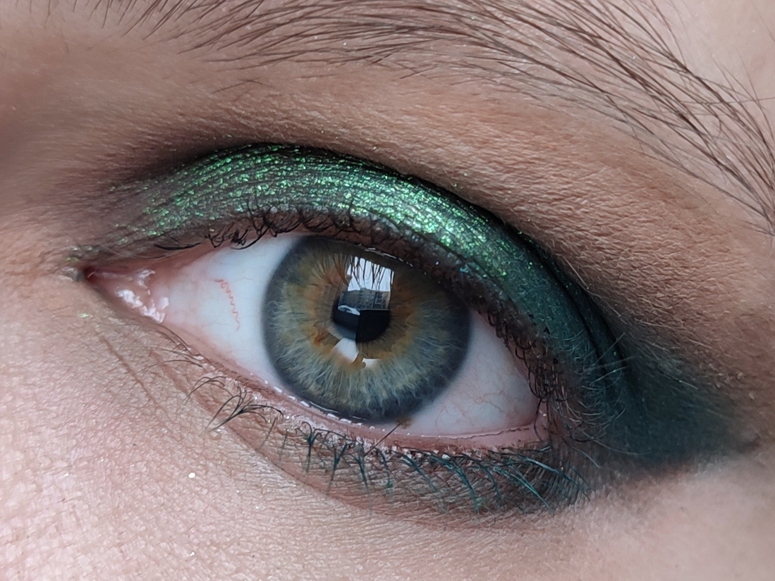 Без базы. Sandy Leaf на все подвижное веко, Fiona во внутренний уголок и чуть-чуть над складкой века (Мой телефон не смог уловить как красиво оттенок горит на глазах, но выглядело как на свотчах, честно!) Стрелка — подводка Kikimora в первом оттенке.