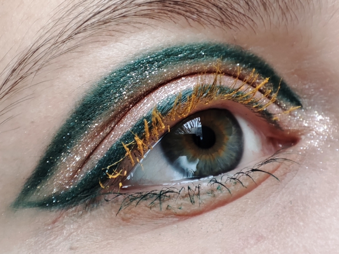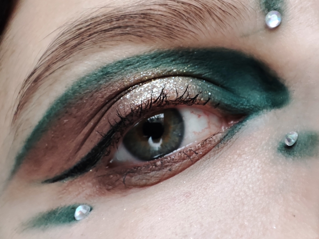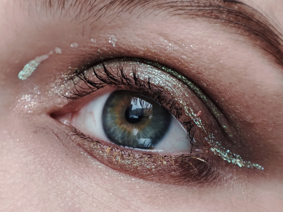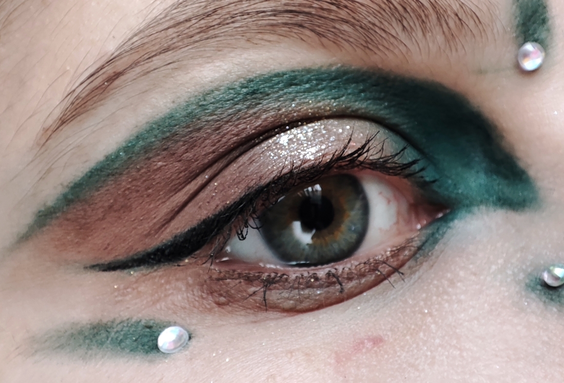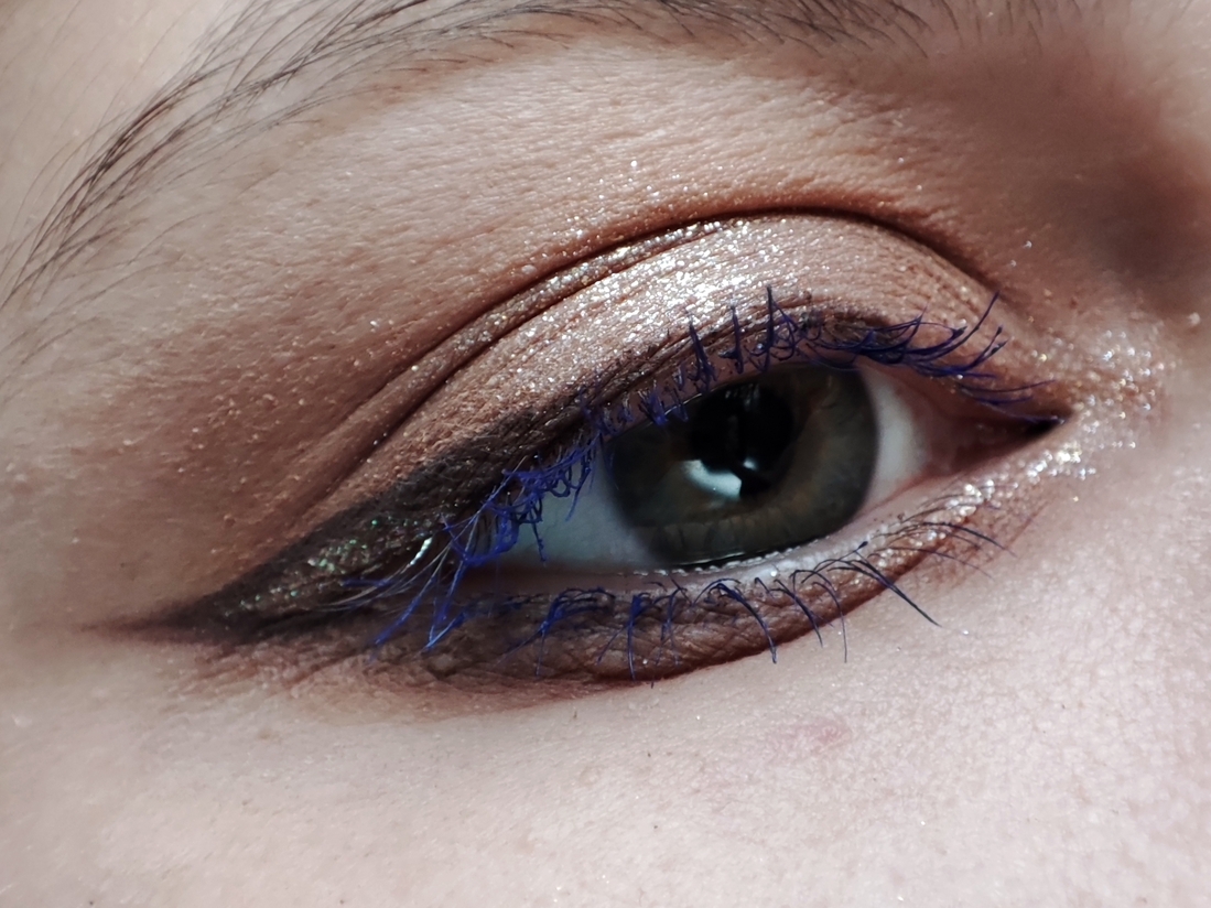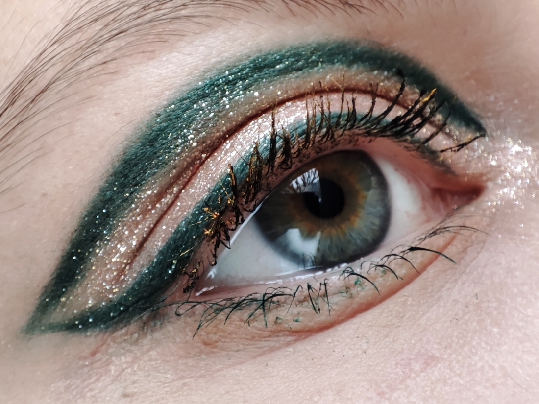 Без базы. Sandy Leaf на все подвижное веко, Fiona во внутренний уголок и чуть-чуть над складкой века (Мой телефон не смог уловить как красиво оттенок горит на глазах, но выглядело как на свотчах, честно!) Стрелка — подводка Kikimora в первом оттенке.