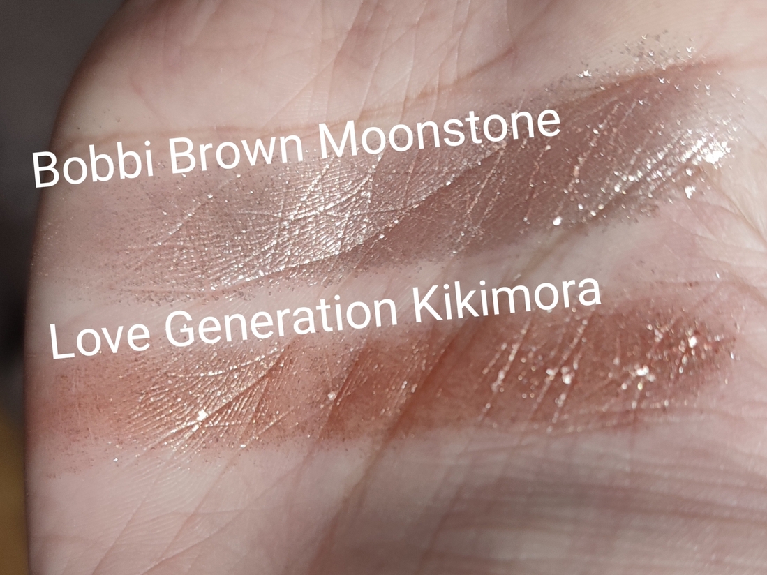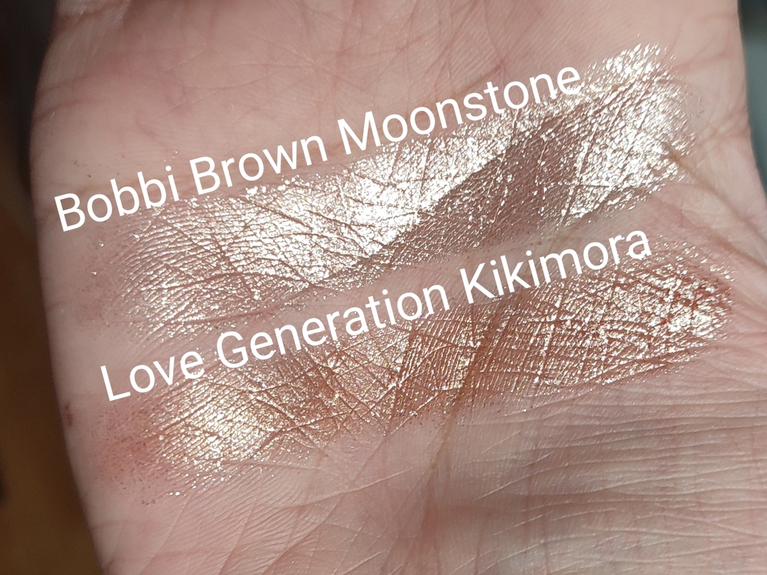 На свотчах можно увидеть, что Birch light тепленькая, имеет рыжую базу, какой нет у Bobbi brown. По текстуре они совершенно разные. Birch light жирная, маслянистая. Moonstone в сравнении очень сухая, но наносятся одинаково легко. По стойкости Birch light уступает. Совершенно разные, но очень близки. Какой вердикт? Если хочется подобной искры, не пугают возможные скатывания и не хочется тратить много денег — бегите, берите!)