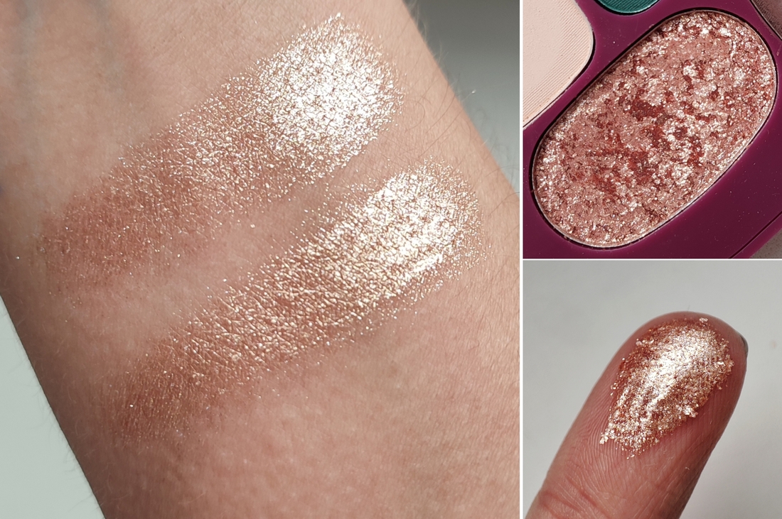 Березовый свет — это спаркл цвета шампанского, на теплой рыженькой базе. Горит — просто вау! По текстуре чуть посуше Фионы, но тоже жирненький. Наносится без осыпаний. Скатывается на базе и без, но легко подправить пальчиком. На подложке из сухих теней никаких огрехов не выдает.