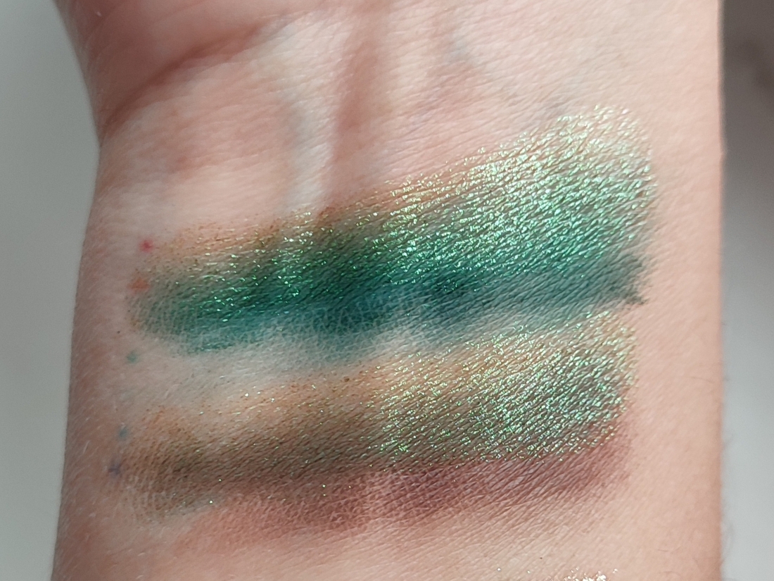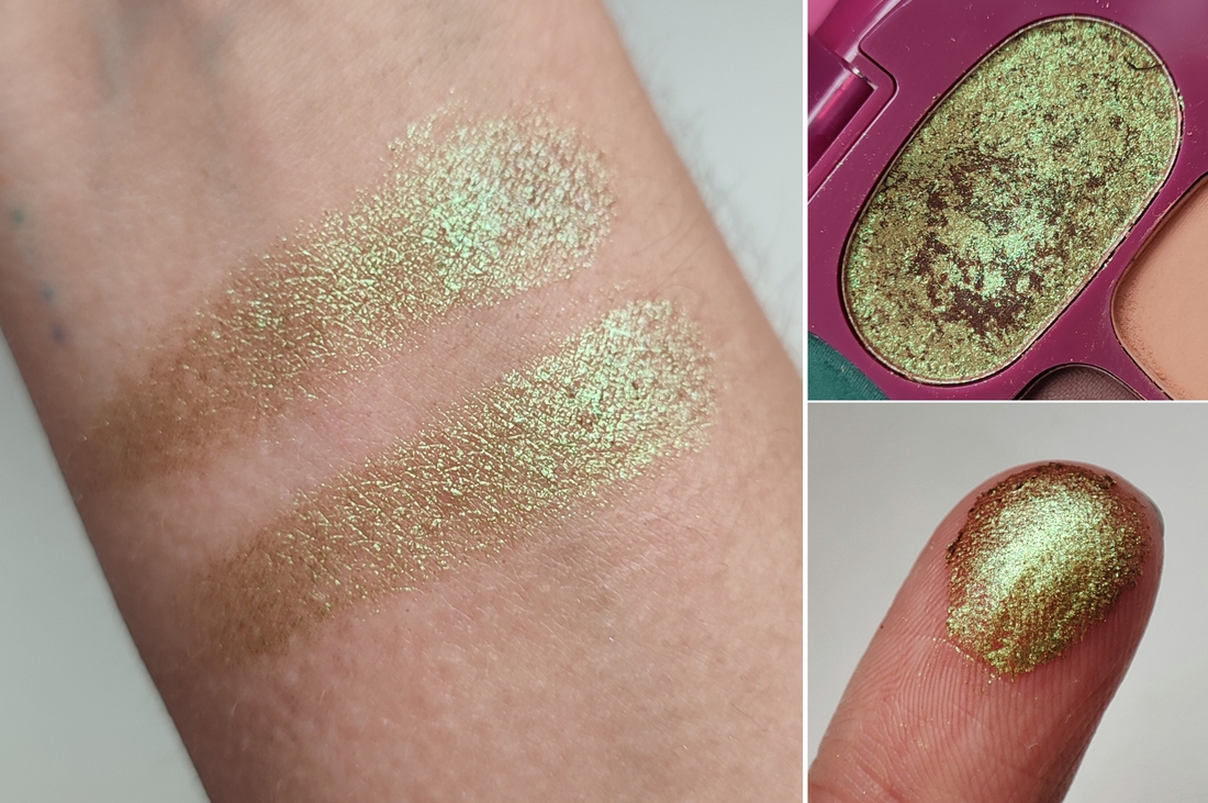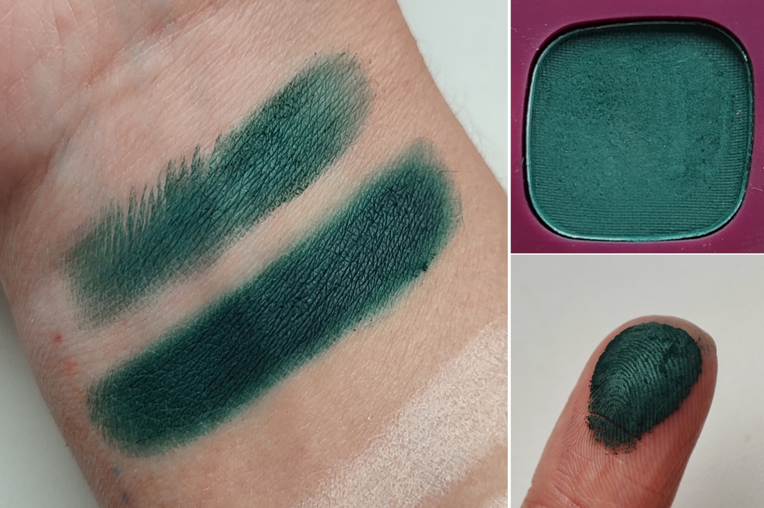 Я сначала не понимала почему выбрали именно такой оттенок зелёного? Чисто цвет зеленки. А он оказывается лягушачий! Лягушка должна тут быть. Видела одну такую, ядовитую. И в оттенке есть чуточку яда — может осыпаться. И эти осыпания кистью смахнуть не получится, потому что пигмента в нем много и он его щедро отдает. По текстуре шелковистый, но чуть посуше остальных матовых. Тушуется хорошо, наносится в целом равномерно.