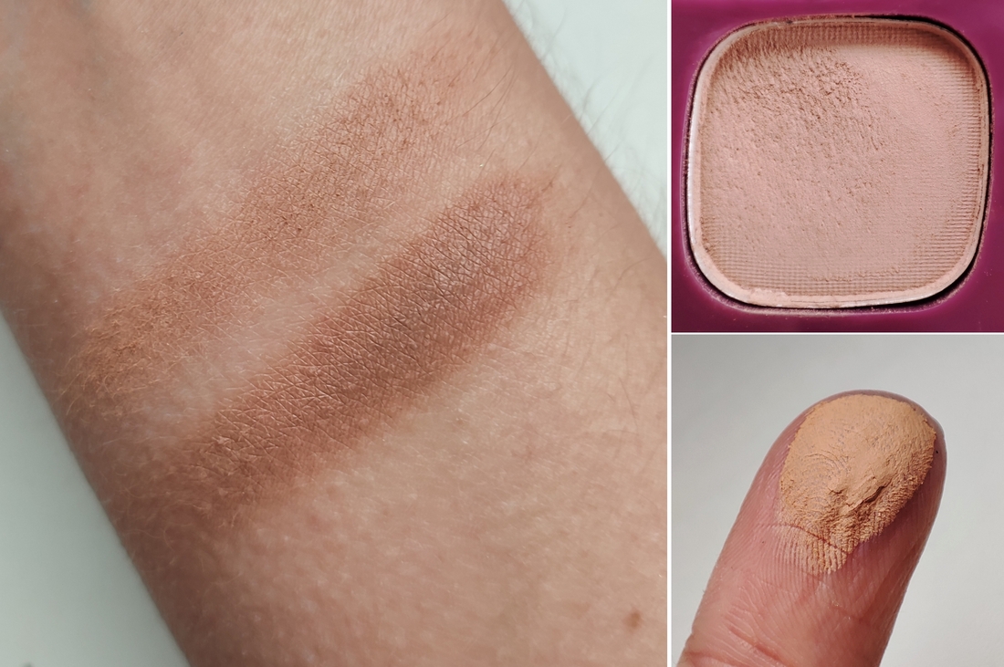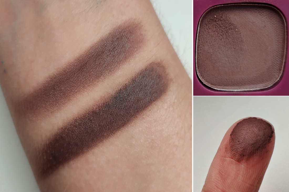 Лесной коричневый. Цвет мокрой трухи расколовшегося пня. Шелковистый, тонкого помола. Очень пигментированный. На моих веках может залипать без базы, но на базе работает прекрасно.