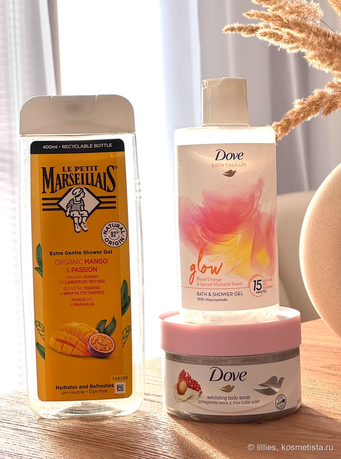 Гель для душа Dove Bath Therapy Glow Blood Orange & Spiced Rhubarb, 400 мл. Купила давно, когда эта серия еще была новинкой. Привлекла, конечно, красивая банка. По ТХ претензий нет — кремовая текстура, хорошо очищает и смывается. Но аромат… просто ядреный. Очень горький, перченый апельсин, душный, тяжелый… Кто не любит резкие отдушки — обходим за два километра. Но мужу очень понравился, собственно он и пользовался им большую часть.