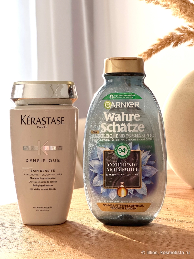 Шампунь для волос Kérastase Densifique Bain Densité, 250 мл. Наконец-то я попробовала Керастаз и это знакомство было очень удачным. Уплотняющий шампунь, очень приятный в использовании, роскошно пахнет, не путает волосы, отлично очищает, при этом не сушит и действительно будто чуть приподнимает корни волос. Спас мою восстанавливающуюся после беременности шевелюру. Обязательно повторю в большом формате.