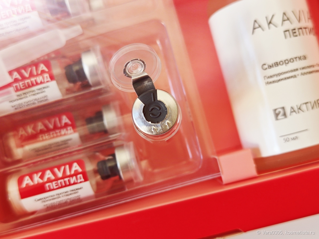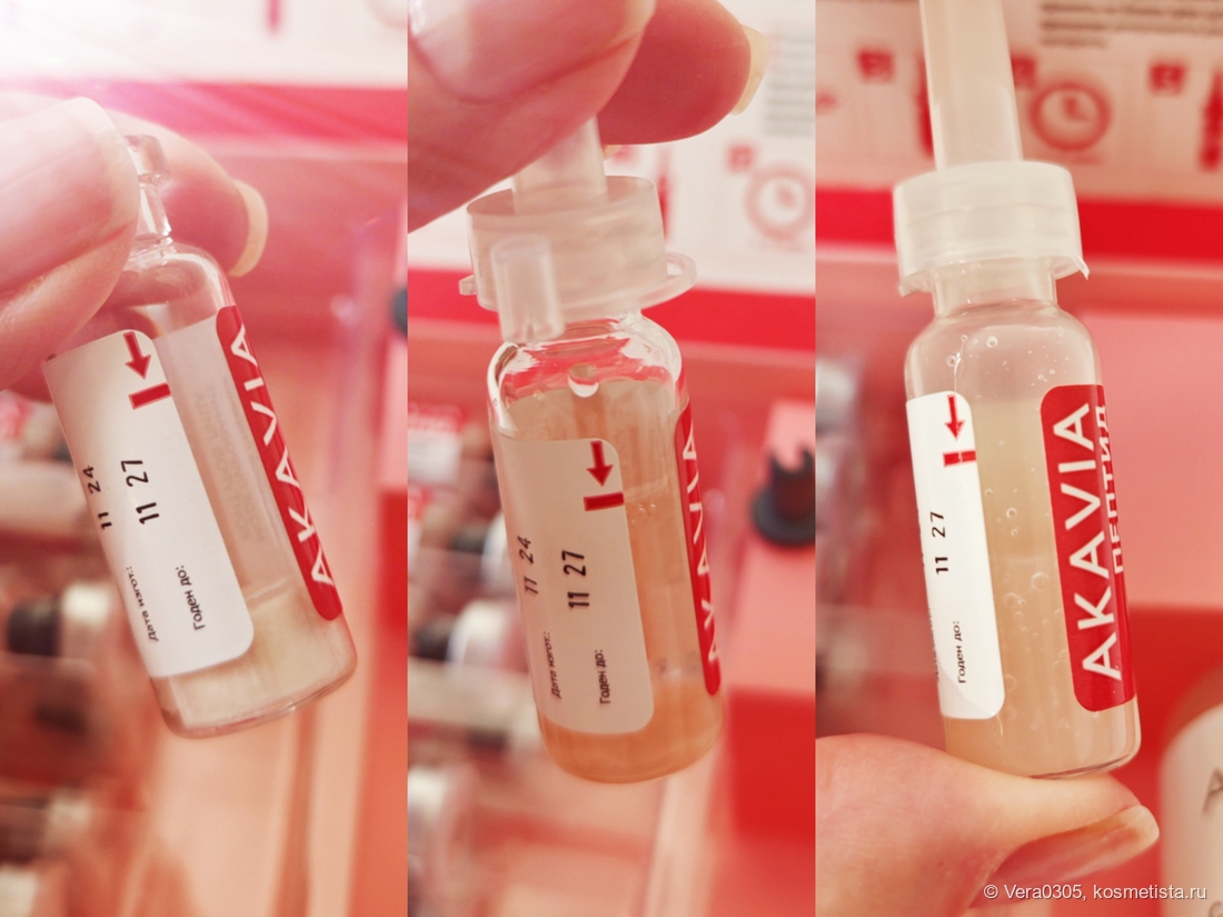 Фишка AKAVIA — сыворотки в формате «собери сам». Ампула с сухими концентратом и гелевая сыворотка-активатор, которая заливается в ампулу. Встряхиваем и получаем готовое средство. Средство готовится малыми дозами, консервантов нет, расходуем быстро — бережем кожу от лишней нагрузки консервантами.