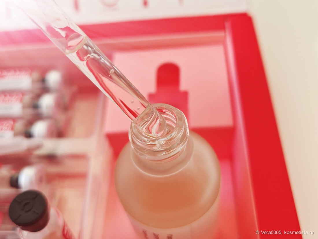Текстура готовой сыворотки текучая, каплю не держит. Капать лучше сразу на лицо и распределять руками.