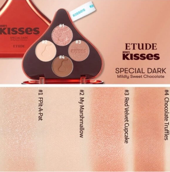 В серии коллабрации с Hershey's есть 3 палетки теней. Все они содержат 4 оттенка и посвящены разным сериям шоколада Hershey's. Самая светлая из них и холодная, выполненная в ореховых оттенках посвящена молочному шоколаду, средняя шоколаду с миндалём, та, что у меня — горькому шоколаду со специями. Мне понравился компактный формат палетки, ассоциация с шоколадом, поэтому на свотчи производителя я не обращала внимания, так как многие корейские средства им не соответствуют.