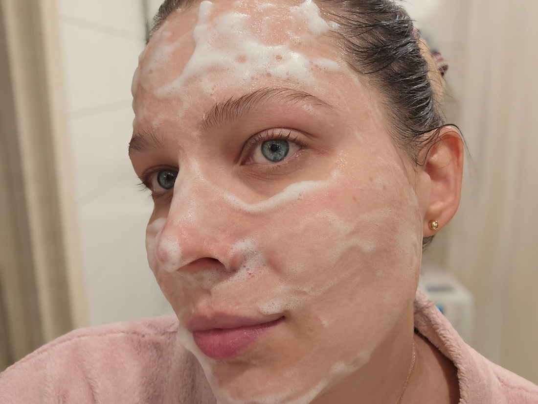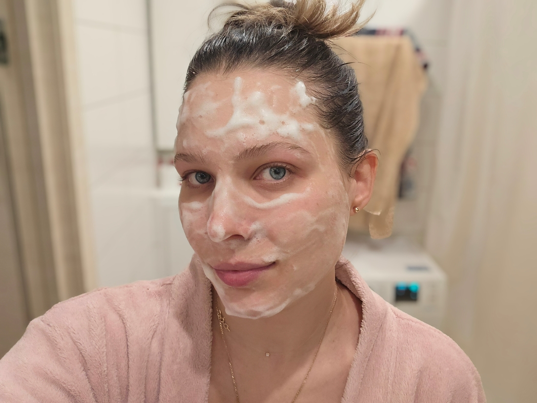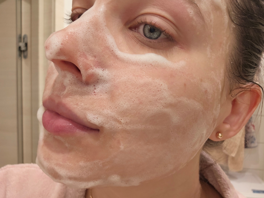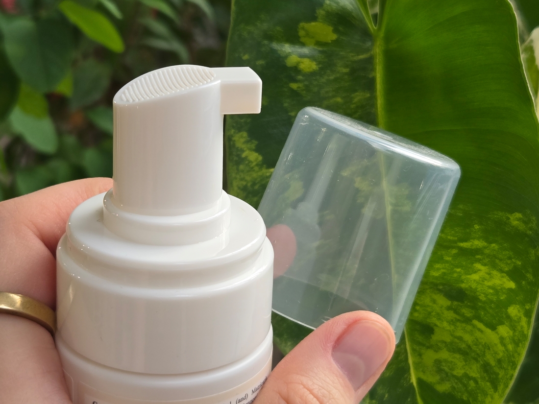 Опишу в кратце флакон. У него удобный плотный колпачок и дозатор, который отлично вспенивает средство. Мне пары нажатий хватает чтоб нанести на все лицо.